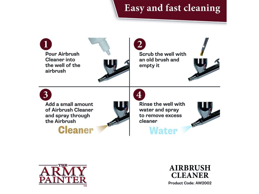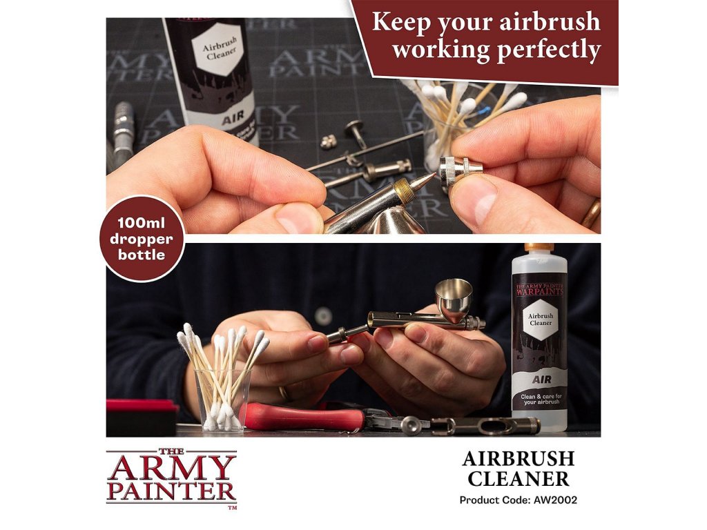 Army Painter: Airbrush Cleaner je čistiaci prípravok na vodnej báze, ktorý je špeciálne vyvinutý na odstránenie zvyškov akrylovej farby zo striekacej pištole - airbrush. Obsah je 100 ml.