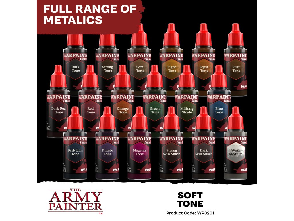 Akrylová farba Fanatic Wash - Soft Tone od výrobcu Army Painter. Vďaka wash farbám ľahko a rýchlo vytvoríte dojem hĺbky a tieňovania na vašich modeloch a miniatúrach. Farby Fanatic ponúkajú bezkonkurenčné krytie, intenzívnu pigmentáciu, hladkú aplikáciu a zároveň sa neuveriteľne jednoducho používajú. Farbu bohatú na pigmenty je možné riediť až do extrémnych úrovní pre pokročilých technikov alebo nanášať priamo na miniatúru pre ľahké pokrytie pri zachovaní rozptylu pigmentu. Objem každej liekovky je 18 ml a obsahuje dve miešacie guličky.
