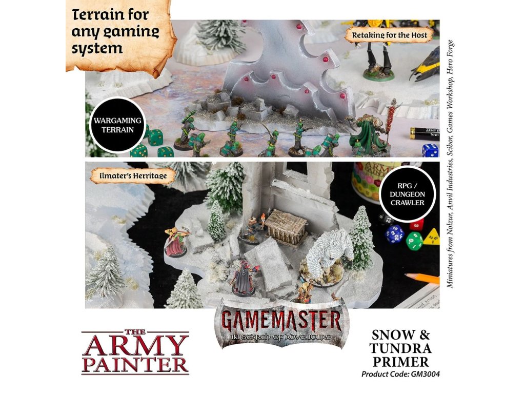 Army Painter: GameMaster Terrain Primer - Snow & Thundra je skvelý základný náter na vytváranie terénov a scenérií k vašim miniatúram. Vysoko kvalitná farba na vodnej báze má matný povrch, je netoxická a bez zápachu. Nebude korodovať materiál - či už používate penu XPS, polystyrén alebo MDF dosky. Balenie obsahuje 300ml. Odkazy video (anglicky)