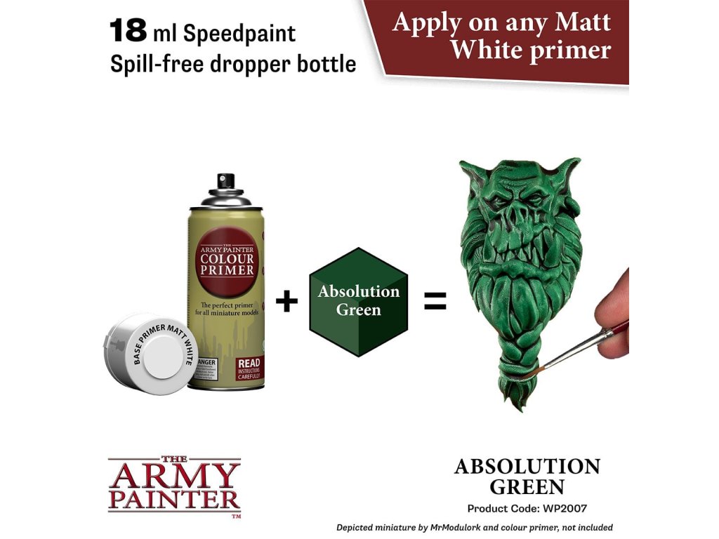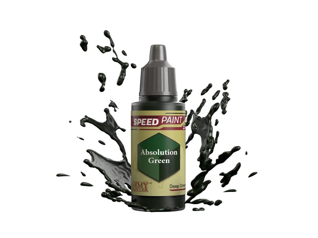 Vysoko kvalitná farba Speedpaint Absolution Green 2.0 od značky Army Painter sa líši lepším novým zložením ako predchádzajúci rad Speedpaint. Farba je vhodná pre miniatúry akéhokoľvek druhu. Farby radu Speedpaint majú redšiu konzistenciu a tým figúrku perfektne vytieňujú vo všetkých záhyboch a skulinách, napriek tomu majú dostatok pigmentu na perfektné krytie. Farbu už neriedime vodou a nanášame na miniatúru ošetrenú základným sprejom alebo farbou. Vzhľadom na konzistenciu farby, odporúčame použiť skôr pevnú paletu. Všetky farby Speedpaint sa dodávajú s dvoma oceľovými miešacími guličkami už vloženými do fľaštičky, čo vám uľahčí dosiahnutie dokonalej konzistencie bez nutnosti dlhého pretrepávania.