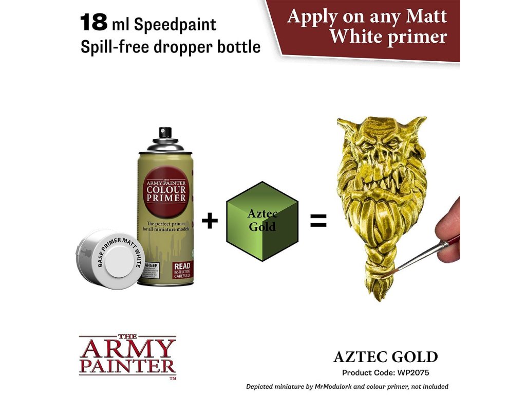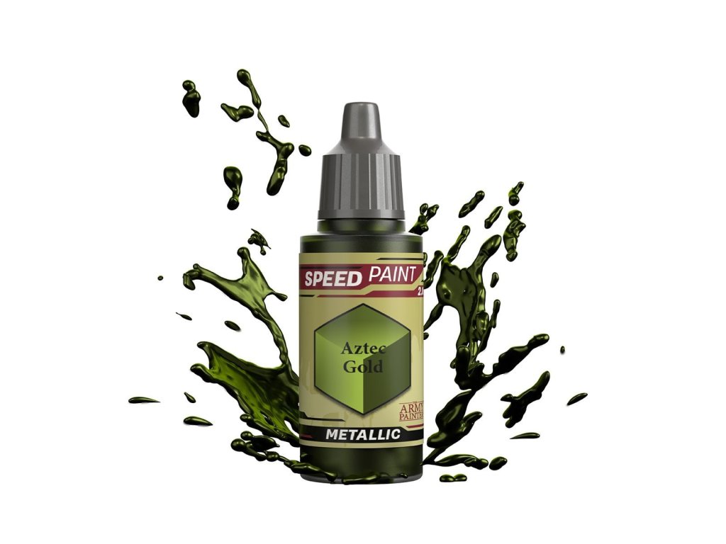 Vysoko kvalitná metalická farba Speedpaint Aztec Gold 2.0 od značky Army Painter sa líši lepším novým zložením ako predchádzajúci rad Speedpaint. Farba je vhodná pre miniatúry akéhokoľvek druhu. Farby radu Speedpaint majú redšiu konzistenciu a tým figúrku perfektne vytieňujú vo všetkých záhyboch a skulinách, napriek tomu majú dostatok pigmentu na perfektné krytie. Farbu už neriedime vodou a nanášame na miniatúru ošetrenú základným sprejom alebo farbou. Vzhľadom na konzistenciu farby, odporúčame použiť skôr pevnú paletu. Všetky farby Speedpaint sa dodávajú s dvoma oceľovými miešacími guličkami už vloženými do fľaštičky, čo vám uľahčí dosiahnutie dokonalej konzistencie bez nutnosti dlhého pretrepávania.