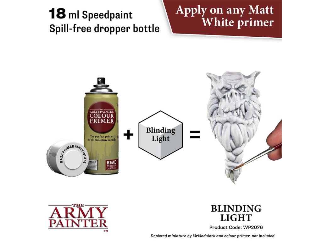 Vysoko kvalitná farba Speedpaint Blinding Light 2.0 od značky Army Painter sa líši lepším novým zložením ako predchádzajúci rad Speedpaint. Farba je vhodná pre miniatúry akéhokoľvek druhu. Farby radu Speedpaint majú redšiu konzistenciu a tým figúrku perfektne vytieňujú vo všetkých záhyboch a skulinách, napriek tomu majú dostatok pigmentu na perfektné krytie. Farbu už neriedime vodou a nanášame na miniatúru ošetrenú základným sprejom alebo farbou. Vzhľadom na konzistenciu farby, odporúčame použiť skôr pevnú paletu. Všetky farby Speedpaint sa dodávajú s dvoma oceľovými miešacími guličkami už vloženými do fľaštičky, čo vám uľahčí dosiahnutie dokonalej konzistencie bez nutnosti dlhého pretrepávania.