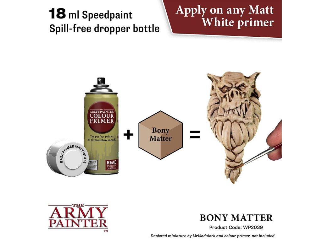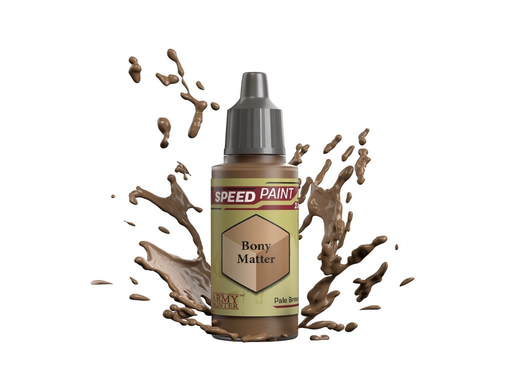 Vysoko kvalitná farba Speedpaint Bony Matter 2.0 od značky Army Painter sa líši lepším novým zložením ako predchádzajúci rad Speedpaint. Farba je vhodná pre miniatúry akéhokoľvek druhu. Farby radu Speedpaint majú redšiu konzistenciu a tým figúrku perfektne vytieňujú vo všetkých záhyboch a skulinách, napriek tomu majú dostatok pigmentu na perfektné krytie. Farbu už neriedime vodou a nanášame na miniatúru ošetrenú základným sprejom alebo farbou. Vzhľadom na konzistenciu farby, odporúčame použiť skôr pevnú paletu. Všetky farby Speedpaint sa dodávajú s dvoma oceľovými miešacími guličkami už vloženými do fľaštičky, čo vám uľahčí dosiahnutie dokonalej konzistencie bez nutnosti dlhého pretrepávania.