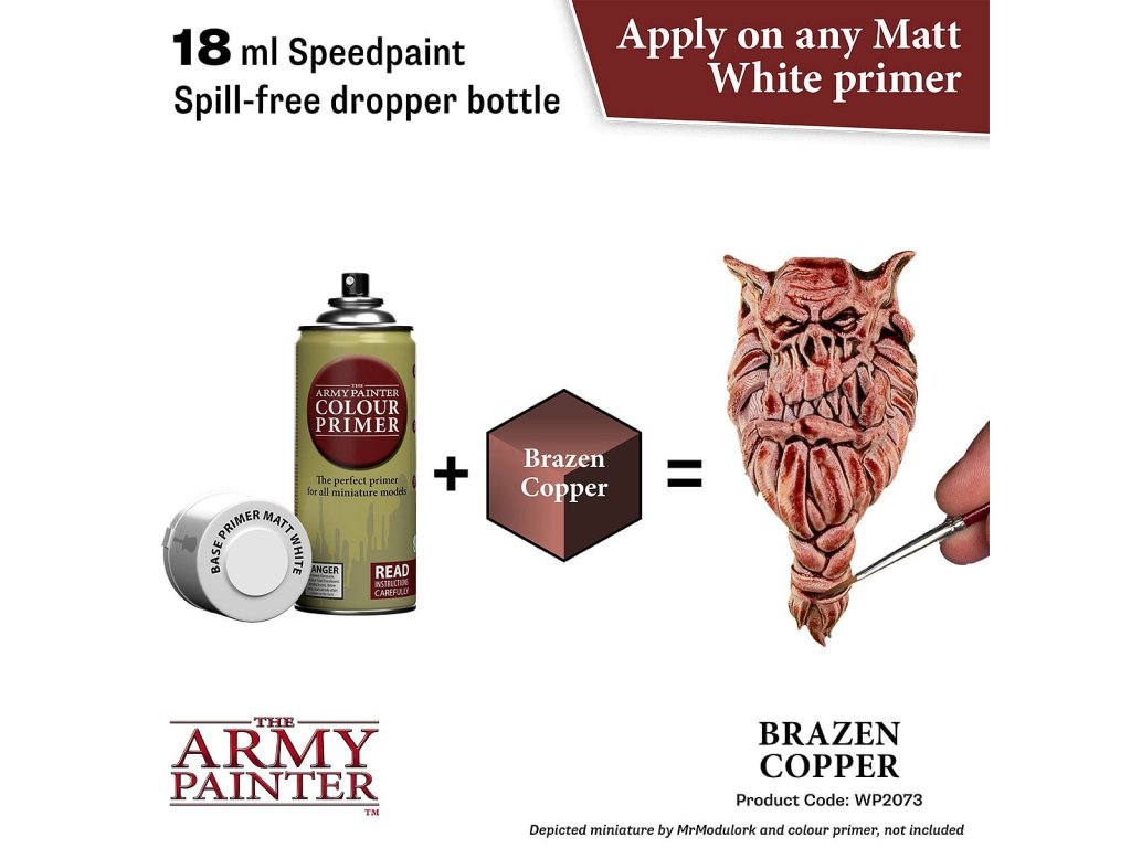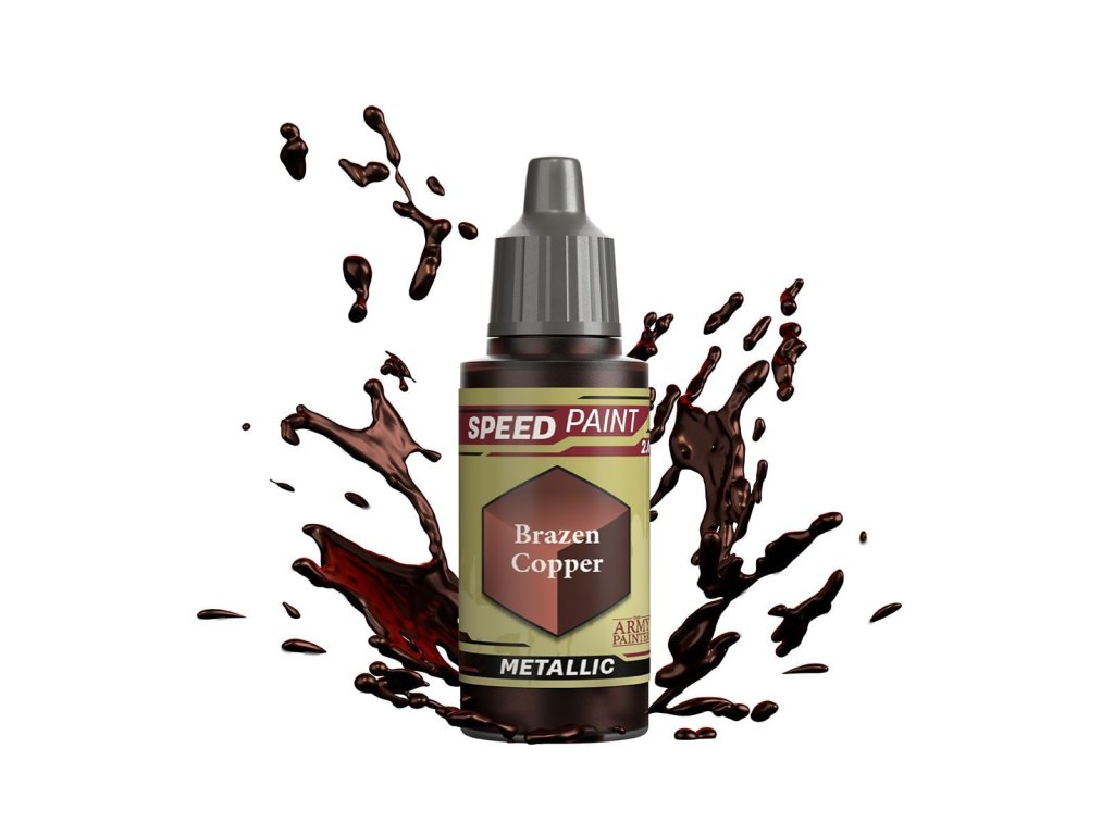 Vysoko kvalitná metalická farba Speedpaint Brazen Copper 2.0 od značky Army Painter sa líši lepším novým zložením ako predchádzajúci rad Speedpaint. Farba je vhodná pre miniatúry akéhokoľvek druhu. Farby radu Speedpaint majú redšiu konzistenciu a tým figúrku perfektne vytieňujú vo všetkých záhyboch a skulinách, napriek tomu majú dostatok pigmentu na perfektné krytie. Farbu už neriedime vodou a nanášame na miniatúru ošetrenú základným sprejom alebo farbou. Vzhľadom na konzistenciu farby, odporúčame použiť skôr pevnú paletu. Všetky farby Speedpaint sa dodávajú s dvoma oceľovými miešacími guličkami už vloženými do fľaštičky, čo vám uľahčí dosiahnutie dokonalej konzistencie bez nutnosti dlhého pretrepávania.