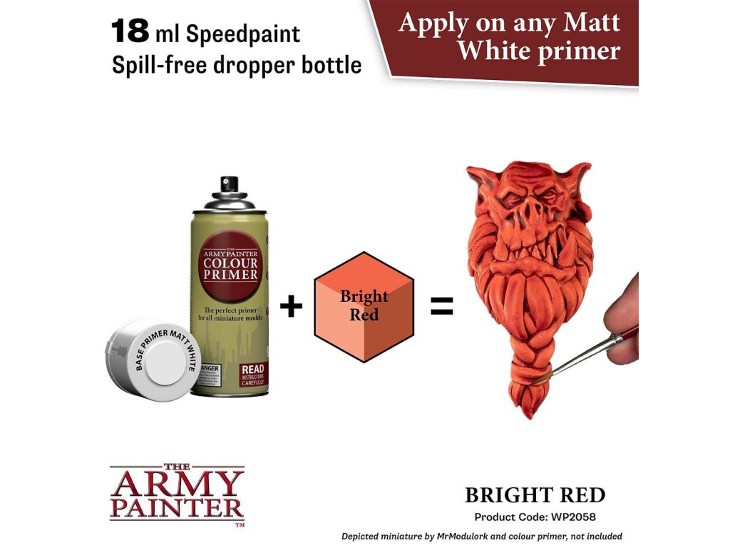 Vysoko kvalitná farba Speedpaint Bright Red 2.0 od značky Army Painter sa líši lepším novým zložením ako predchádzajúci rad Speedpaint. Farba je vhodná pre miniatúry akéhokoľvek druhu. Farby radu Speedpaint majú redšiu konzistenciu a tým figúrku perfektne vytieňujú vo všetkých záhyboch a skulinách, napriek tomu majú dostatok pigmentu na perfektné krytie. Farbu už neriedime vodou a nanášame na miniatúru ošetrenú základným sprejom alebo farbou. Vzhľadom na konzistenciu farby, odporúčame použiť skôr pevnú paletu. Všetky farby Speedpaint sa dodávajú s dvoma oceľovými miešacími guličkami už vloženými do fľaštičky, čo vám uľahčí dosiahnutie dokonalej konzistencie bez nutnosti dlhého pretrepávania.