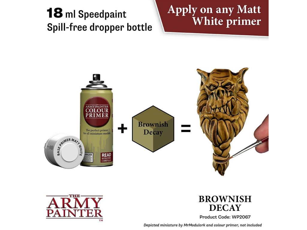 Vysoko kvalitná farba Speedpaint Brownish Decay 2.0 od značky Army Painter sa líši lepším novým zložením ako predchádzajúci rad Speedpaint. Farba je vhodná pre miniatúry akéhokoľvek druhu. Farby radu Speedpaint majú redšiu konzistenciu a tým figúrku perfektne vytieňujú vo všetkých záhyboch a skulinách, napriek tomu majú dostatok pigmentu na perfektné krytie. Farbu už neriedime vodou a nanášame na miniatúru ošetrenú základným sprejom alebo farbou. Vzhľadom na konzistenciu farby, odporúčame použiť skôr pevnú paletu. Všetky farby Speedpaint sa dodávajú s dvoma oceľovými miešacími guličkami už vloženými do fľaštičky, čo vám uľahčí dosiahnutie dokonalej konzistencie bez nutnosti dlhého pretrepávania.