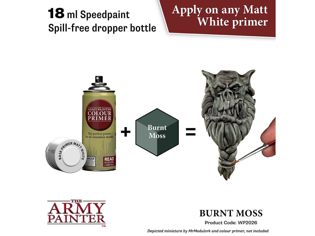 Vysoko kvalitná farba Speedpaint Burnt Moss 2.0 od značky Army Painter sa líši lepším novým zložením ako predchádzajúci rad Speedpaint. Farba je vhodná pre miniatúry akéhokoľvek druhu. Farby radu Speedpaint majú redšiu konzistenciu a tým figúrku perfektne vytieňujú vo všetkých záhyboch a skulinách, napriek tomu majú dostatok pigmentu na perfektné krytie. Farbu už neriedime vodou a nanášame na miniatúru ošetrenú základným sprejom alebo farbou. Vzhľadom na konzistenciu farby, odporúčame použiť skôr pevnú paletu. Všetky farby Speedpaint sa dodávajú s dvoma oceľovými miešacími guličkami už vloženými do fľaštičky, čo vám uľahčí dosiahnutie dokonalej konzistencie bez nutnosti dlhého pretrepávania.