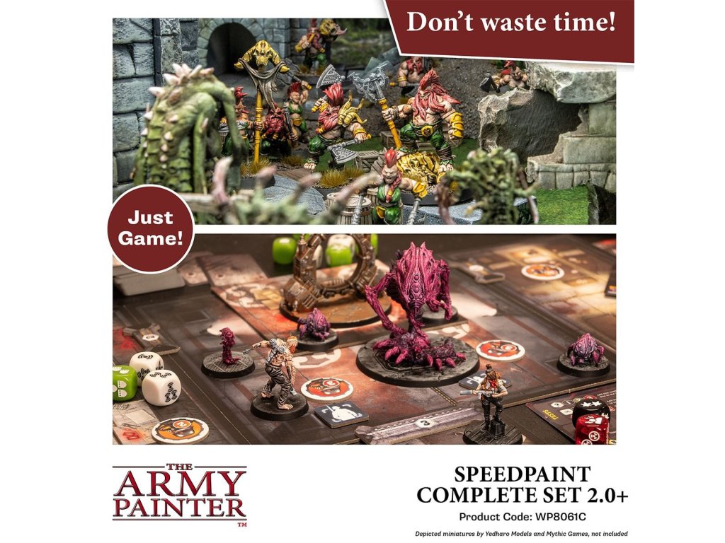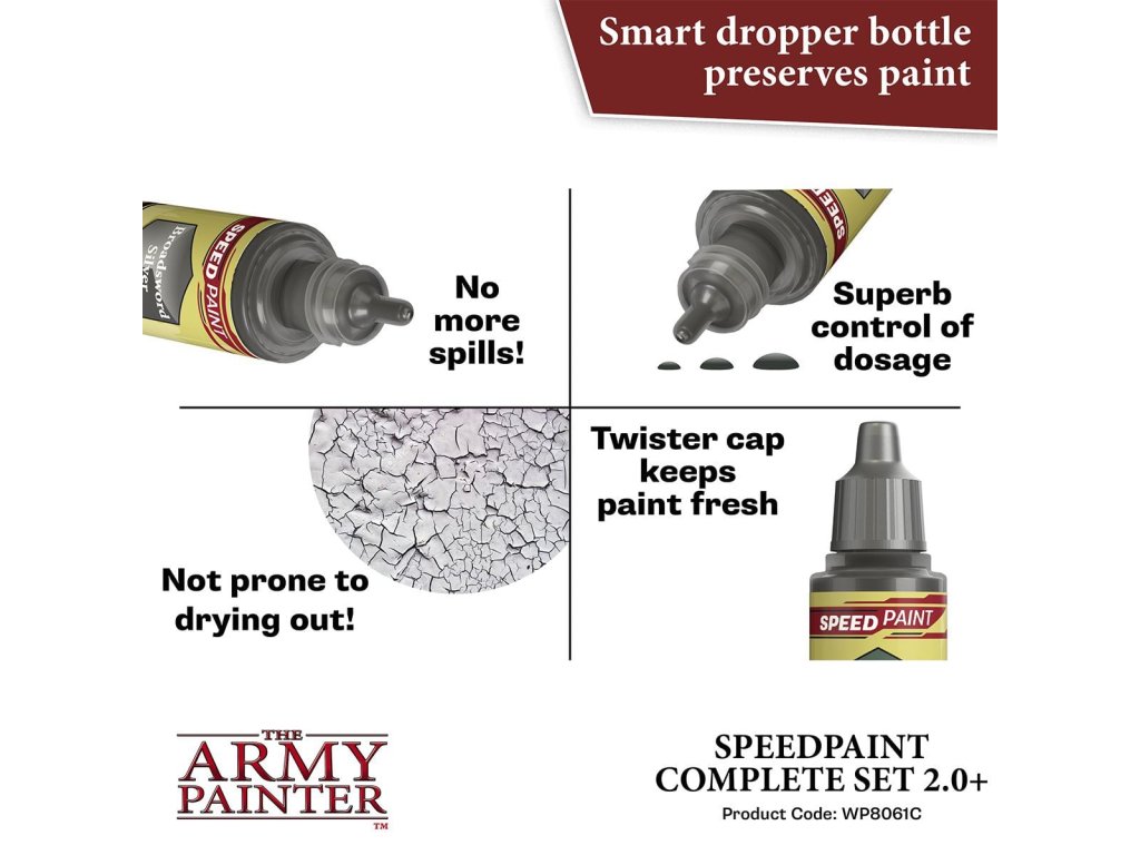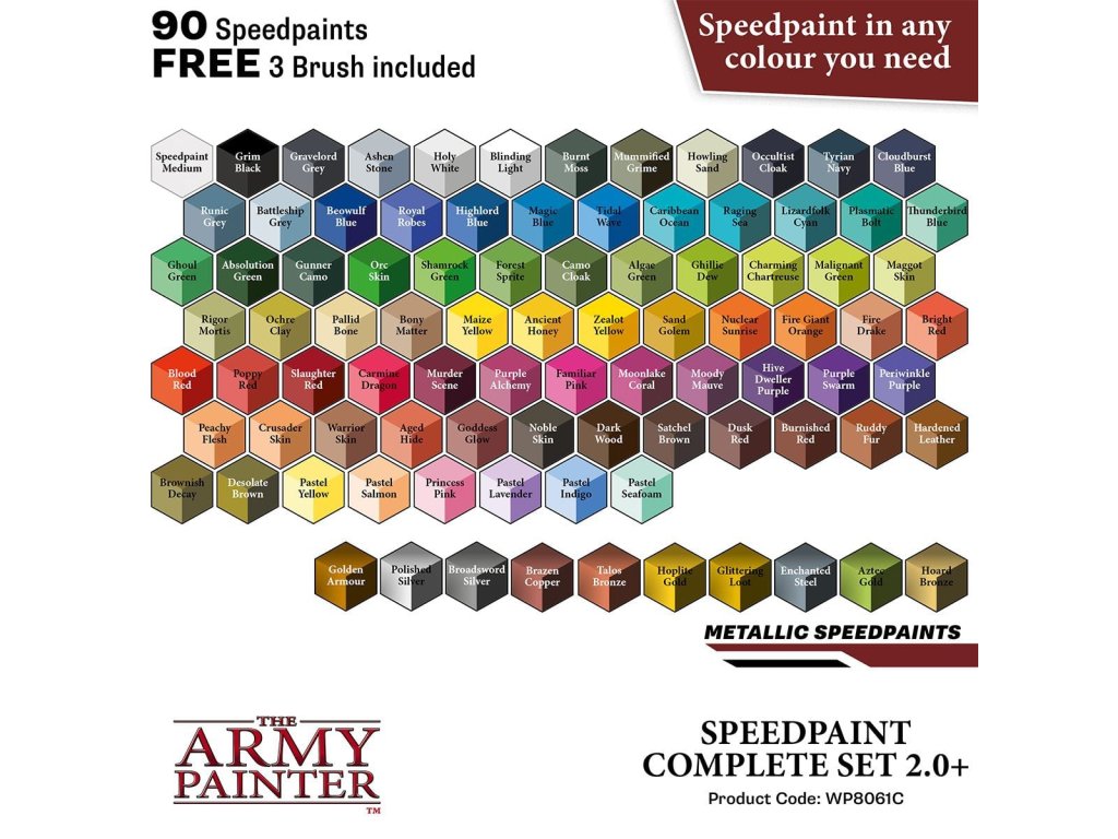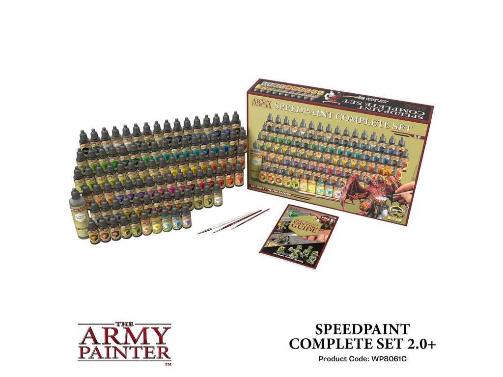 Súprava Army Painter: Speedpaint Complete Set 2.0 obsahuje 90 farieb Speedpaint, s ktorými môžeš ihneď začať farbiť miniatúry a ušetriť čas na hranie! Stačí len naniesť vrstvu farby Speedpaint na miniatúru opatrenú základným náterom a máš hotovo. Obsah balenia: 79 farieb Speedpaint 10 Speedpaint Metallics 1 Speedpaint Medium 100 ml štetce 1x Precise Detail, 1x Basecoating a Monster Brush Objem každej fľaštičky je 18ml a obsahuje dve miešacie guličky.