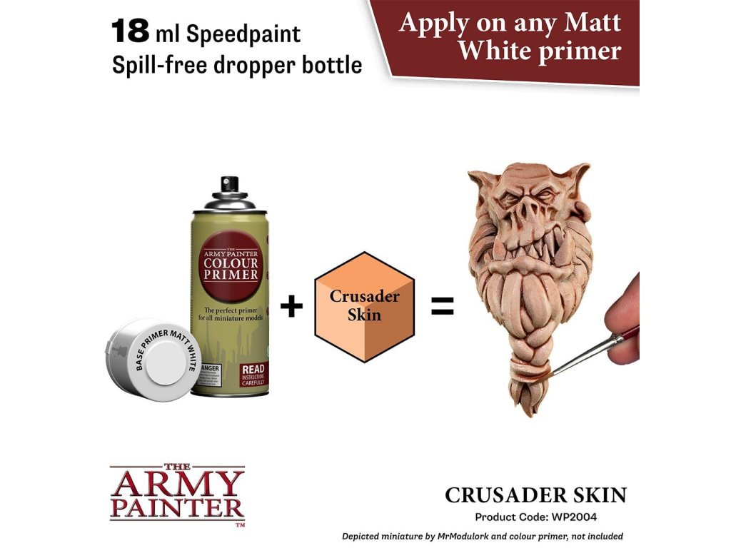 Vysoko kvalitná farba Speedpaint Crusader Skin 2.0 od značky Army Painter sa líši lepším novým zložením ako predchádzajúci rad Speedpaint. Farba je vhodná pre miniatúry akéhokoľvek druhu. Farby radu Speedpaint majú redšiu konzistenciu a tým figúrku perfektne vytieňujú vo všetkých záhyboch a skulinách, napriek tomu majú dostatok pigmentu na perfektné krytie. Farbu už neriedime vodou a nanášame na miniatúru ošetrenú základným sprejom alebo farbou. Vzhľadom na konzistenciu farby, odporúčame použiť skôr pevnú paletu. Všetky farby Speedpaint sa dodávajú s dvoma oceľovými miešacími guličkami už vloženými do fľaštičky, čo vám uľahčí dosiahnutie dokonalej konzistencie bez nutnosti dlhého pretrepávania.