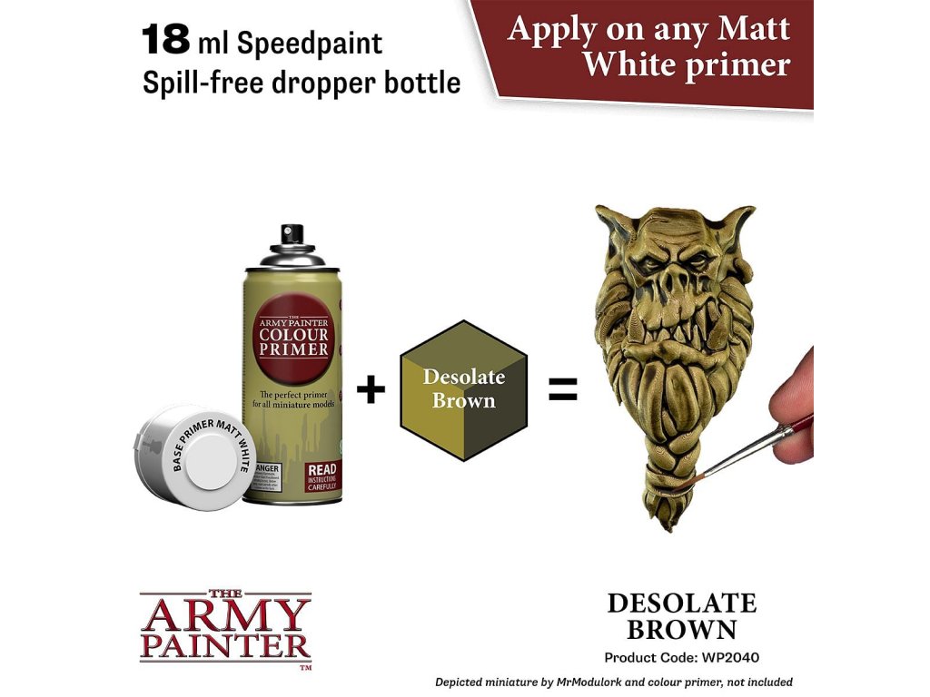 Vysoko kvalitná farba Speedpaint Desolate Brown 2.0 od značky Army Painter sa líši lepším novým zložením ako predchádzajúci rad Speedpaint. Farba je vhodná pre miniatúry akéhokoľvek druhu. Farby radu Speedpaint majú redšiu konzistenciu a tým figúrku perfektne vytieňujú vo všetkých záhyboch a skulinách, napriek tomu majú dostatok pigmentu na perfektné krytie. Farbu už neriedime vodou a nanášame na miniatúru ošetrenú základným sprejom alebo farbou. Vzhľadom na konzistenciu farby, odporúčame použiť skôr pevnú paletu. Všetky farby Speedpaint sa dodávajú s dvoma oceľovými miešacími guličkami už vloženými do fľaštičky, čo vám uľahčí dosiahnutie dokonalej konzistencie bez nutnosti dlhého pretrepávania.