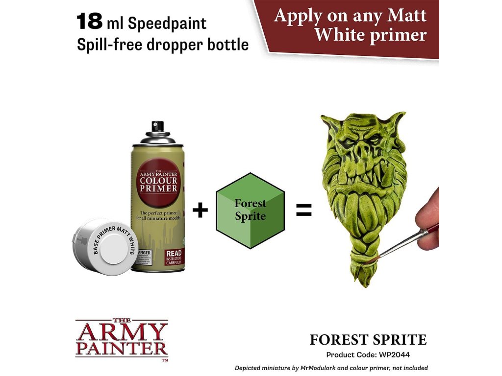 Vysoko kvalitná farba Speedpaint Forest Sprite 2.0 od značky Army Painter sa líši lepším novým zložením ako predchádzajúci rad Speedpaint. Farba je vhodná pre miniatúry akéhokoľvek druhu. Farby radu Speedpaint majú redšiu konzistenciu a tým figúrku perfektne vytieňujú vo všetkých záhyboch a skulinách, napriek tomu majú dostatok pigmentu na perfektné krytie. Farbu už neriedime vodou a nanášame na miniatúru ošetrenú základným sprejom alebo farbou. Vzhľadom na konzistenciu farby, odporúčame použiť skôr pevnú paletu. Všetky farby Speedpaint sa dodávajú s dvoma oceľovými miešacími guličkami už vloženými do fľaštičky, čo vám uľahčí dosiahnutie dokonalej konzistencie bez nutnosti dlhého pretrepávania.