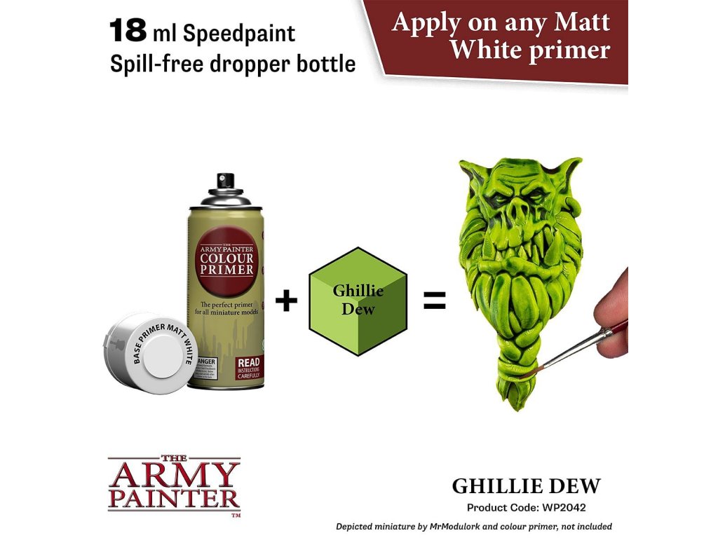 Vysoko kvalitná farba Speedpaint Ghillie Dew 2.0 od značky Army Painter sa líši lepším novým zložením ako predchádzajúci rad Speedpaint. Farba je vhodná pre miniatúry akéhokoľvek druhu. Farby radu Speedpaint majú redšiu konzistenciu a tým figúrku perfektne vytieňujú vo všetkých záhyboch a skulinách, napriek tomu majú dostatok pigmentu na perfektné krytie. Farbu už neriedime vodou a nanášame na miniatúru ošetrenú základným sprejom alebo farbou. Vzhľadom na konzistenciu farby, odporúčame použiť skôr pevnú paletu. Všetky farby Speedpaint sa dodávajú s dvoma oceľovými miešacími guličkami už vloženými do fľaštičky, čo vám uľahčí dosiahnutie dokonalej konzistencie bez nutnosti dlhého pretrepávania.