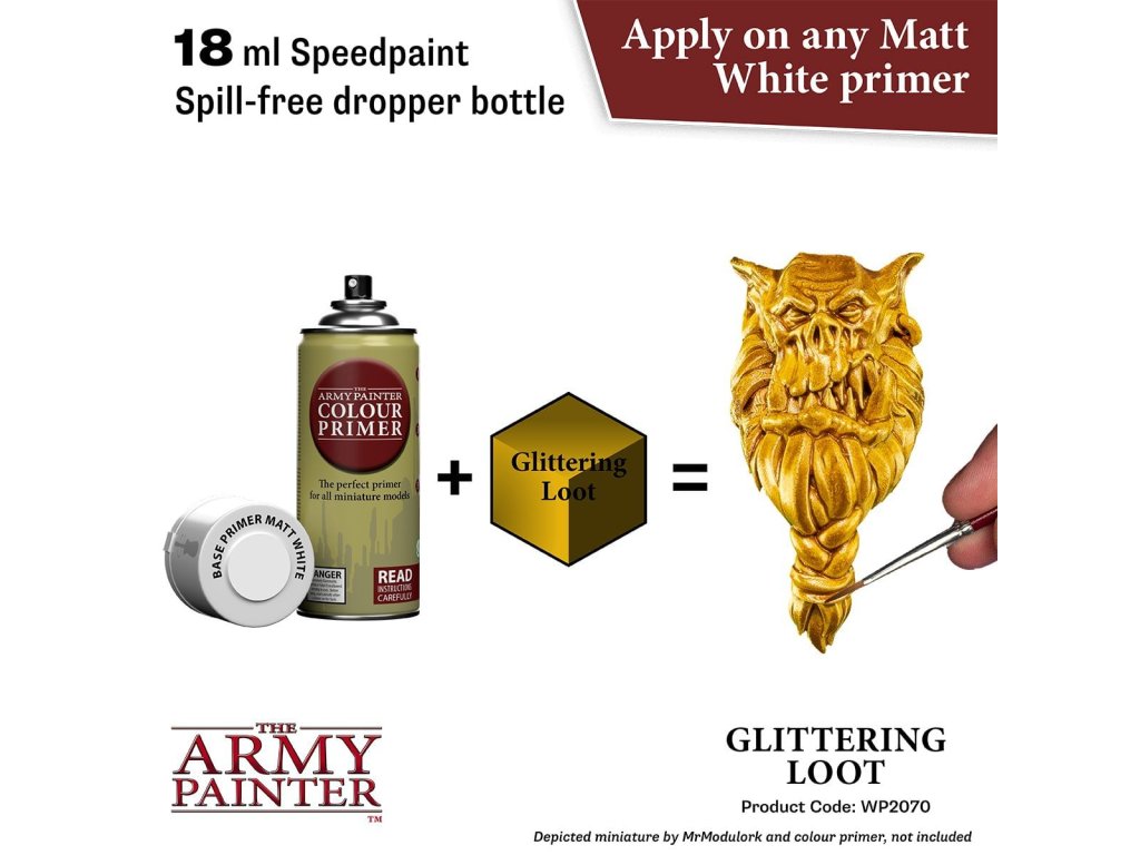 Vysoko kvalitná metalická farba Speedpaint Glittering Loot 2.0 od značky Army Painter sa líši lepším novým zložením ako predchádzajúci rad Speedpaint. Farba je vhodná pre miniatúry akéhokoľvek druhu. Farby radu Speedpaint majú redšiu konzistenciu a tým figúrku perfektne vytieňujú vo všetkých záhyboch a skulinách, napriek tomu majú dostatok pigmentu na perfektné krytie. Farbu už neriedime vodou a nanášame na miniatúru ošetrenú základným sprejom alebo farbou. Vzhľadom na konzistenciu farby, odporúčame použiť skôr pevnú paletu. Všetky farby Speedpaint sa dodávajú s dvoma oceľovými miešacími guličkami už vloženými do fľaštičky, čo vám uľahčí dosiahnutie dokonalej konzistencie bez nutnosti dlhého pretrepávania.