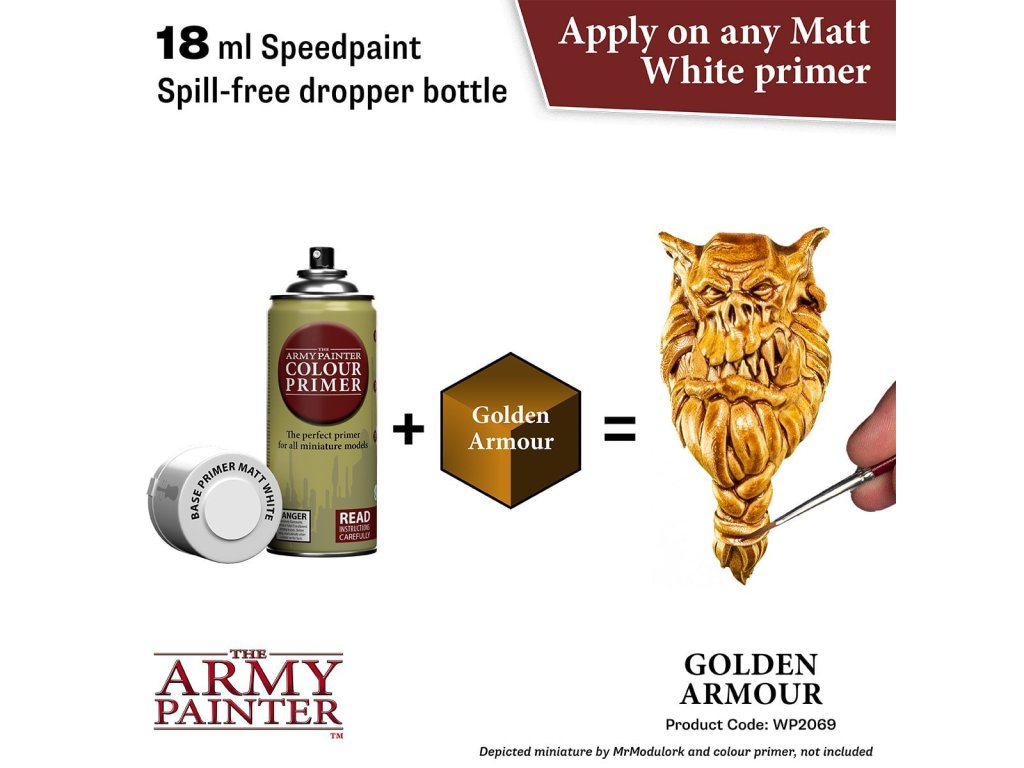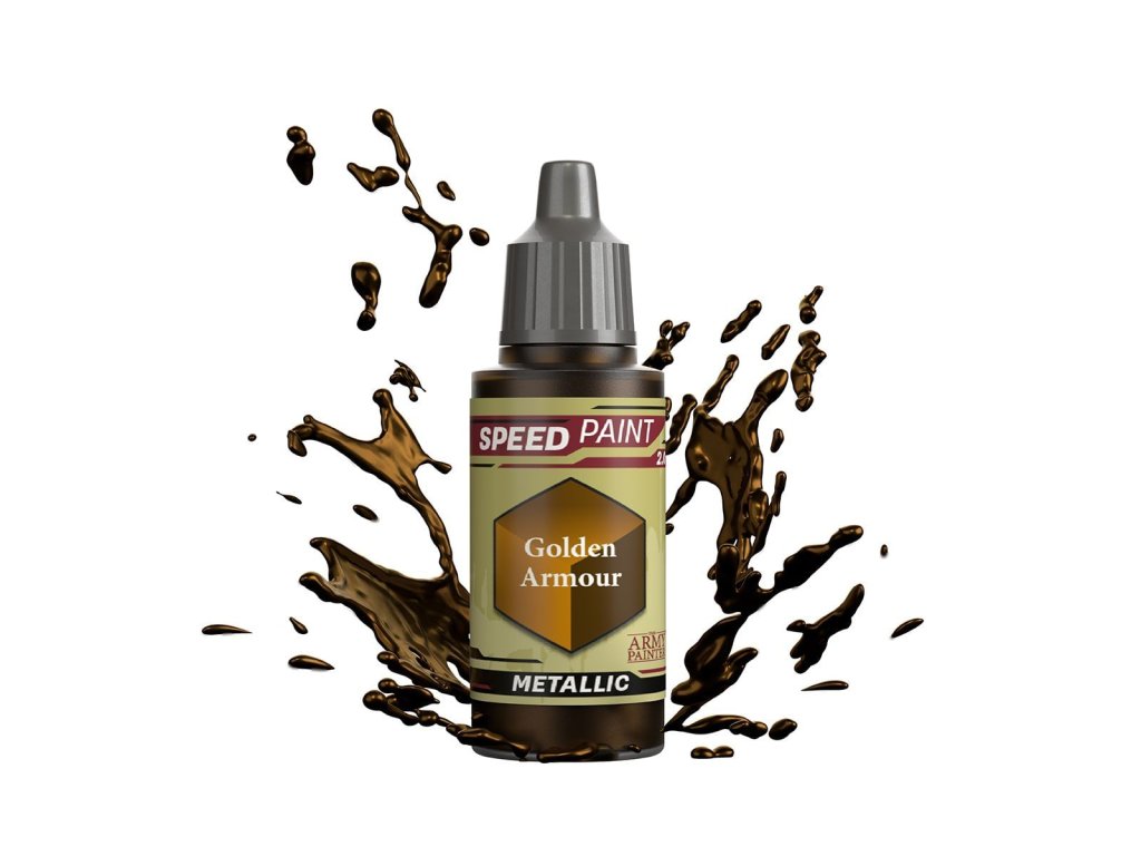 Vysoko kvalitná metalická farba Speedpaint Golden Armour 2.0 od značky Army Painter sa líši lepším novým zložením ako predchádzajúci rad Speedpaint. Farba je vhodná pre miniatúry akéhokoľvek druhu. Farby radu Speedpaint majú redšiu konzistenciu a tým figúrku perfektne vytieňujú vo všetkých záhyboch a skulinách, napriek tomu majú dostatok pigmentu na perfektné krytie. Farbu už neriedime vodou a nanášame na miniatúru ošetrenú základným sprejom alebo farbou. Vzhľadom na konzistenciu farby, odporúčame použiť skôr pevnú paletu. Všetky farby Speedpaint sa dodávajú s dvoma oceľovými miešacími guličkami už vloženými do fľaštičky, čo vám uľahčí dosiahnutie dokonalej konzistencie bez nutnosti dlhého pretrepávania.
