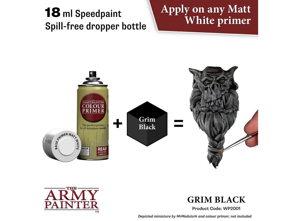 Vysoko kvalitná farba Speedpaint Grim Black 2.0 od značky Army Painter sa líši lepším novým zložením ako predchádzajúci rad Speedpaint. Farba je vhodná pre miniatúry akéhokoľvek druhu. Farby radu Speedpaint majú redšiu konzistenciu a tým figúrku perfektne vytieňujú vo všetkých záhyboch a skulinách, napriek tomu majú dostatok pigmentu na perfektné krytie. Farbu už neriedime vodou a nanášame na miniatúru ošetrenú základným sprejom alebo farbou. Vzhľadom na konzistenciu farby, odporúčame použiť skôr pevnú paletu. Všetky farby Speedpaint sa dodávajú s dvoma oceľovými miešacími guličkami už vloženými do fľaštičky, čo vám uľahčí dosiahnutie dokonalej konzistencie bez nutnosti dlhého pretrepávania.