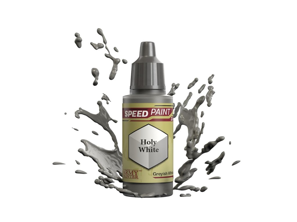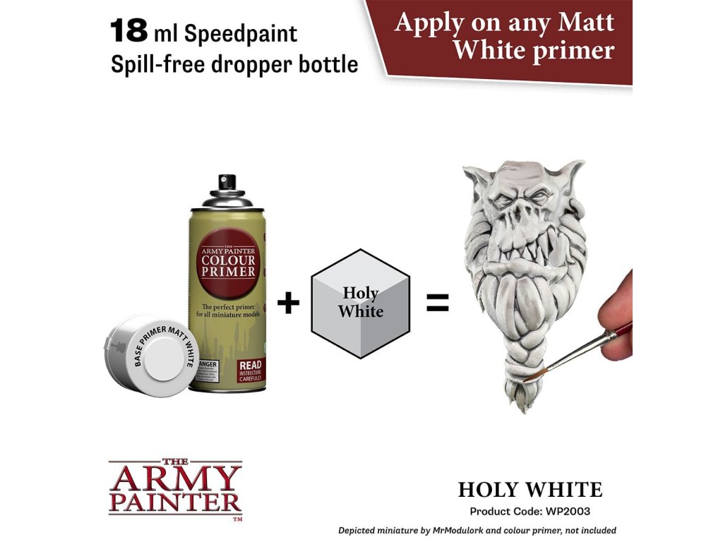 Vysoko kvalitná farba Speedpaint Holy White 2.0 od značky Army Painter sa líši lepším novým zložením ako predchádzajúci rad Speedpaint. Farba je vhodná pre miniatúry akéhokoľvek druhu. Farby radu Speedpaint majú redšiu konzistenciu a tým figúrku perfektne vytieňujú vo všetkých záhyboch a skulinách, napriek tomu majú dostatok pigmentu na perfektné krytie. Farbu už neriedime vodou a nanášame na miniatúru ošetrenú základným sprejom alebo farbou. Vzhľadom na konzistenciu farby, odporúčame použiť skôr pevnú paletu. Všetky farby Speedpaint sa dodávajú s dvoma oceľovými miešacími guličkami už vloženými do fľaštičky, čo vám uľahčí dosiahnutie dokonalej konzistencie bez nutnosti dlhého pretrepávania.