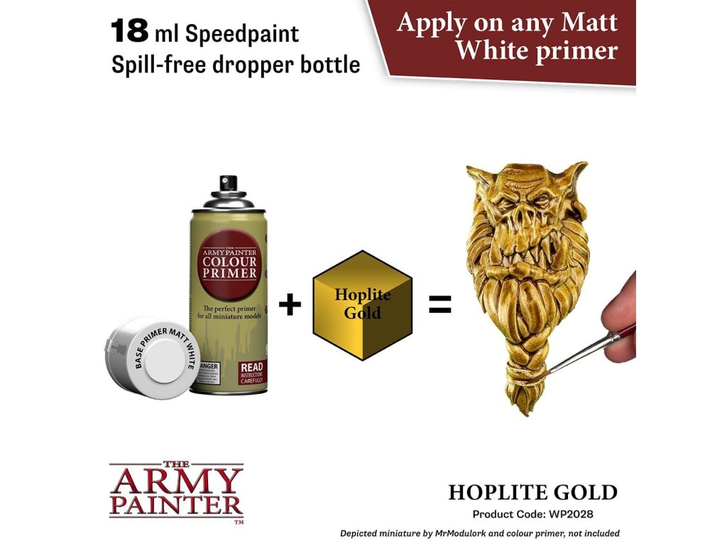 Vysoko kvalitná metalická farba Speedpaint Hoplite Gold 2.0 od značky Army Painter sa líši lepším novým zložením ako predchádzajúci rad Speedpaint. Farba je vhodná pre miniatúry akéhokoľvek druhu. Farby radu Speedpaint majú redšiu konzistenciu a tým figúrku perfektne vytieňujú vo všetkých záhyboch a skulinách, napriek tomu majú dostatok pigmentu na perfektné krytie. Farbu už neriedime vodou a nanášame na miniatúru ošetrenú základným sprejom alebo farbou. Vzhľadom na konzistenciu farby, odporúčame použiť skôr pevnú paletu. Všetky farby Speedpaint sa dodávajú s dvoma oceľovými miešacími guličkami už vloženými do fľaštičky, čo vám uľahčí dosiahnutie dokonalej konzistencie bez nutnosti dlhého pretrepávania.