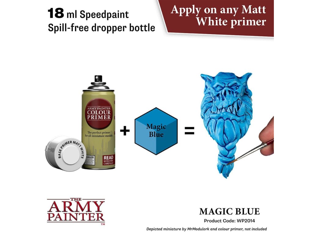 Vysoko kvalitná farba Speedpaint Magic Blue 2.0 od značky Army Painter sa líši lepším novým zložením ako predchádzajúci rad Speedpaint. Farba je vhodná pre miniatúry akéhokoľvek druhu. Farby radu Speedpaint majú redšiu konzistenciu a tým figúrku perfektne vytieňujú vo všetkých záhyboch a skulinách, napriek tomu majú dostatok pigmentu na perfektné krytie. Farbu už neriedime vodou a nanášame na miniatúru ošetrenú základným sprejom alebo farbou. Vzhľadom na konzistenciu farby, odporúčame použiť skôr pevnú paletu. Všetky farby Speedpaint sa dodávajú s dvoma oceľovými miešacími guličkami už vloženými do fľaštičky, čo vám uľahčí dosiahnutie dokonalej konzistencie bez nutnosti dlhého pretrepávania.