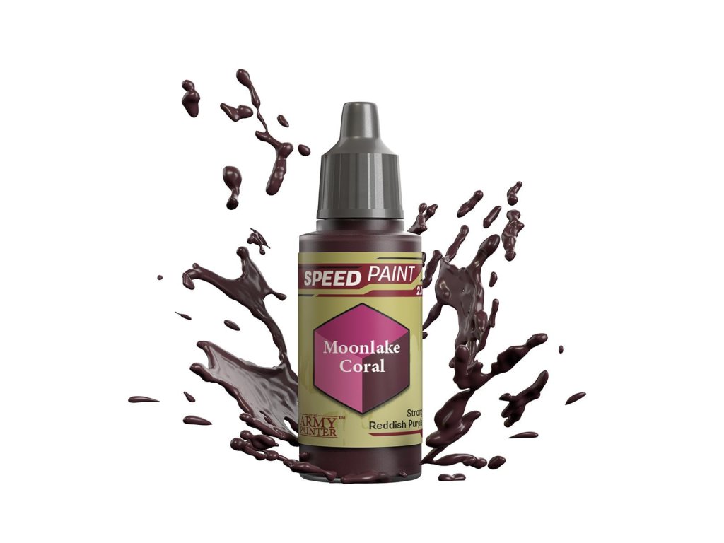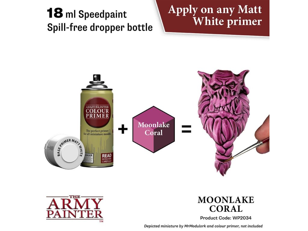 Vysoko kvalitná farba Speedpaint Moonlake Coral 2.0 od značky Army Painter sa líši lepším novým zložením ako predchádzajúci rad Speedpaint. Farba je vhodná pre miniatúry akéhokoľvek druhu. Farby radu Speedpaint majú redšiu konzistenciu a tým figúrku perfektne vytieňujú vo všetkých záhyboch a skulinách, napriek tomu majú dostatok pigmentu na perfektné krytie. Farbu už neriedime vodou a nanášame na miniatúru ošetrenú základným sprejom alebo farbou. Vzhľadom na konzistenciu farby, odporúčame použiť skôr pevnú paletu. Všetky farby Speedpaint sa dodávajú s dvoma oceľovými miešacími guličkami už vloženými do fľaštičky, čo vám uľahčí dosiahnutie dokonalej konzistencie bez nutnosti dlhého pretrepávania.