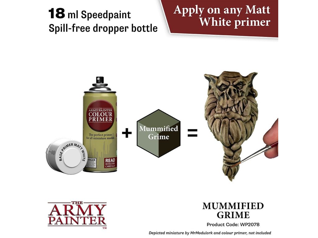 Vysoko kvalitná farba Speedpaint Mummified Grime 2.0 od značky Army Painter sa líši lepším novým zložením ako predchádzajúci rad Speedpaint. Farba je vhodná pre miniatúry akéhokoľvek druhu. Farby radu Speedpaint majú redšiu konzistenciu a tým figúrku perfektne vytieňujú vo všetkých záhyboch a skulinách, napriek tomu majú dostatok pigmentu na perfektné krytie. Farbu už neriedime vodou a nanášame na miniatúru ošetrenú základným sprejom alebo farbou. Vzhľadom na konzistenciu farby, odporúčame použiť skôr pevnú paletu. Všetky farby Speedpaint sa dodávajú s dvoma oceľovými miešacími guličkami už vloženými do fľaštičky, čo vám uľahčí dosiahnutie dokonalej konzistencie bez nutnosti dlhého pretrepávania.