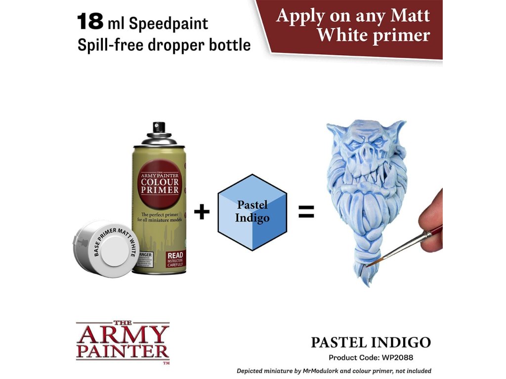 Vysoko kvalitná farba Speedpaint Pastel Indigo 2.0 od značky Army Painter sa líši lepším novým zložením ako predchádzajúci rad Speedpaint. Farba je vhodná pre miniatúry akéhokoľvek druhu. Farby radu Speedpaint majú redšiu konzistenciu a tým figúrku perfektne vytieňujú vo všetkých záhyboch a skulinách, napriek tomu majú dostatok pigmentu na perfektné krytie. Farbu už neriedime vodou a nanášame na miniatúru ošetrenú základným sprejom alebo farbou. Vzhľadom na konzistenciu farby, odporúčame použiť skôr pevnú paletu. Všetky farby Speedpaint sa dodávajú s dvoma oceľovými miešacími guličkami už vloženými do fľaštičky, čo vám uľahčí dosiahnutie dokonalej konzistencie bez nutnosti dlhého pretrepávania.