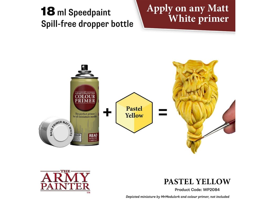 Vysoko kvalitná farba Speedpaint Pastel Yellow 2.0 od značky Army Painter sa líši lepším novým zložením ako predchádzajúci rad Speedpaint. Farba je vhodná pre miniatúry akéhokoľvek druhu. Farby radu Speedpaint majú redšiu konzistenciu a tým figúrku perfektne vytieňujú vo všetkých záhyboch a skulinách, napriek tomu majú dostatok pigmentu na perfektné krytie. Farbu už neriedime vodou a nanášame na miniatúru ošetrenú základným sprejom alebo farbou. Vzhľadom na konzistenciu farby, odporúčame použiť skôr pevnú paletu. Všetky farby Speedpaint sa dodávajú s dvoma oceľovými miešacími guličkami už vloženými do fľaštičky, čo vám uľahčí dosiahnutie dokonalej konzistencie bez nutnosti dlhého pretrepávania.
