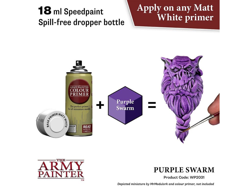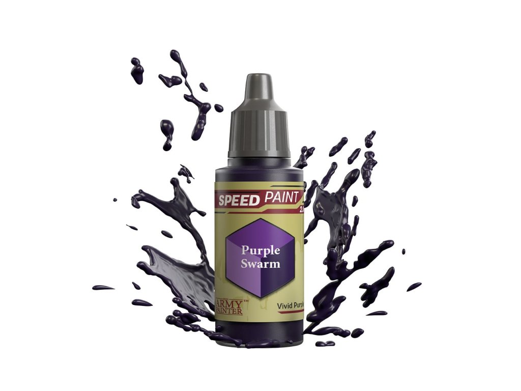 Vysoko kvalitná farba Speedpaint Purple Swarm 2.0 od značky Army Painter sa líši lepším novým zložením ako predchádzajúci rad Speedpaint. Farba je vhodná pre miniatúry akéhokoľvek druhu. Farby radu Speedpaint majú redšiu konzistenciu a tým figúrku perfektne vytieňujú vo všetkých záhyboch a skulinách, napriek tomu majú dostatok pigmentu na perfektné krytie. Farbu už neriedime vodou a nanášame na miniatúru ošetrenú základným sprejom alebo farbou. Vzhľadom na konzistenciu farby, odporúčame použiť skôr pevnú paletu. Všetky farby Speedpaint sa dodávajú s dvoma oceľovými miešacími guličkami už vloženými do fľaštičky, čo vám uľahčí dosiahnutie dokonalej konzistencie bez nutnosti dlhého pretrepávania.