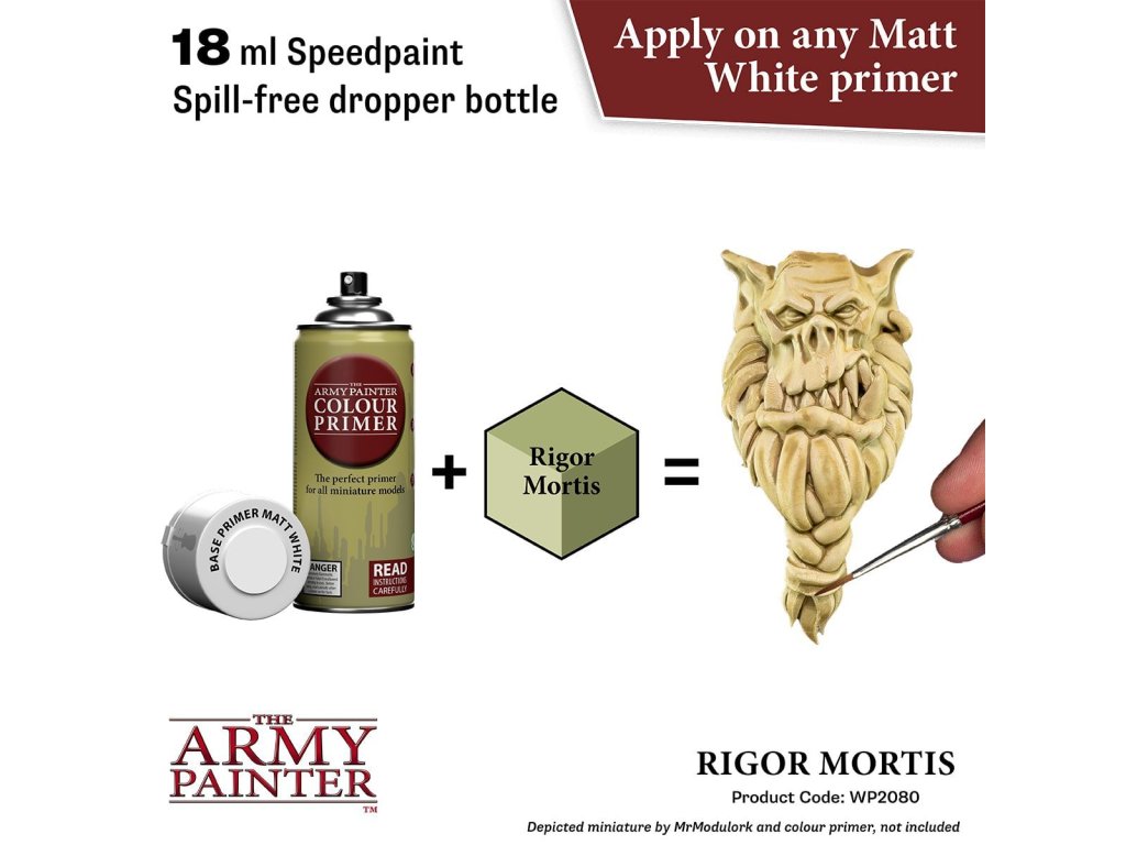 Vysoko kvalitná farba Speedpaint Rigor Mortis 2.0 od značky Army Painter sa líši lepším novým zložením ako predchádzajúci rad Speedpaint. Farba je vhodná pre miniatúry akéhokoľvek druhu. Farby radu Speedpaint majú redšiu konzistenciu a tým figúrku perfektne vytieňujú vo všetkých záhyboch a skulinách, napriek tomu majú dostatok pigmentu na perfektné krytie. Farbu už neriedime vodou a nanášame na miniatúru ošetrenú základným sprejom alebo farbou. Vzhľadom na konzistenciu farby, odporúčame použiť skôr pevnú paletu. Všetky farby Speedpaint sa dodávajú s dvoma oceľovými miešacími guličkami už vloženými do fľaštičky, čo vám uľahčí dosiahnutie dokonalej konzistencie bez nutnosti dlhého pretrepávania.