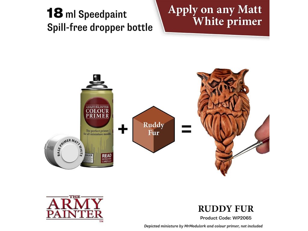 Vysoko kvalitná farba Speedpaint Ruddy Fur 2.0 od značky Army Painter sa líši lepším novým zložením ako predchádzajúci rad Speedpaint. Farba je vhodná pre miniatúry akéhokoľvek druhu. Farby radu Speedpaint majú redšiu konzistenciu a tým figúrku perfektne vytieňujú vo všetkých záhyboch a skulinách, napriek tomu majú dostatok pigmentu na perfektné krytie. Farbu už neriedime vodou a nanášame na miniatúru ošetrenú základným sprejom alebo farbou. Vzhľadom na konzistenciu farby, odporúčame použiť skôr pevnú paletu. Všetky farby Speedpaint sa dodávajú s dvoma oceľovými miešacími guličkami už vloženými do fľaštičky, čo vám uľahčí dosiahnutie dokonalej konzistencie bez nutnosti dlhého pretrepávania.