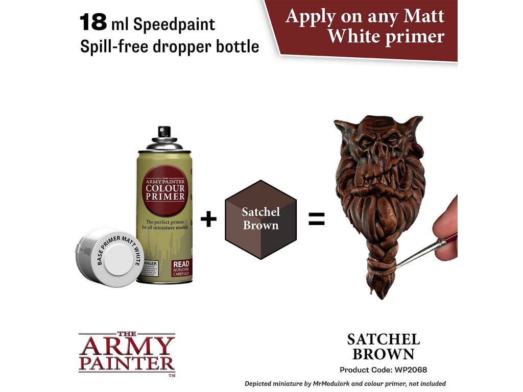 Vysoko kvalitná farba Speedpaint Satchel Brown 2.0 od značky Army Painter sa líši lepším novým zložením ako predchádzajúci rad Speedpaint. Farba je vhodná pre miniatúry akéhokoľvek druhu. Farby radu Speedpaint majú redšiu konzistenciu a tým figúrku perfektne vytieňujú vo všetkých záhyboch a skulinách, napriek tomu majú dostatok pigmentu na perfektné krytie. Farbu už neriedime vodou a nanášame na miniatúru ošetrenú základným sprejom alebo farbou. Vzhľadom na konzistenciu farby, odporúčame použiť skôr pevnú paletu. Všetky farby Speedpaint sa dodávajú s dvoma oceľovými miešacími guličkami už vloženými do fľaštičky, čo vám uľahčí dosiahnutie dokonalej konzistencie bez nutnosti dlhého pretrepávania.