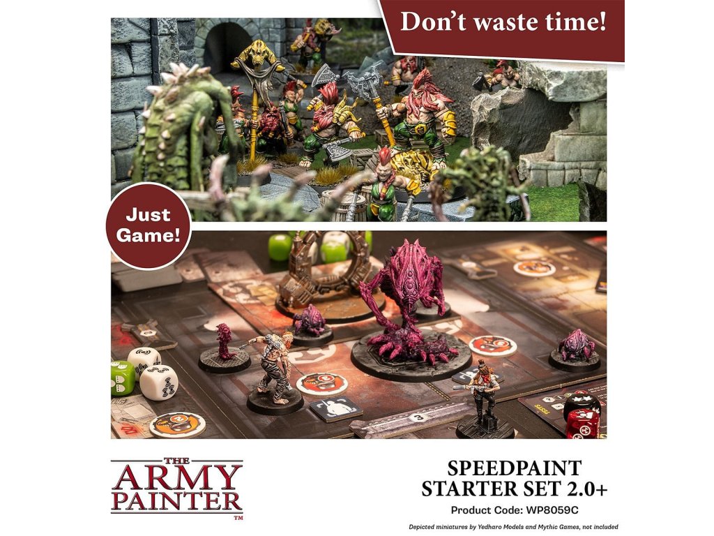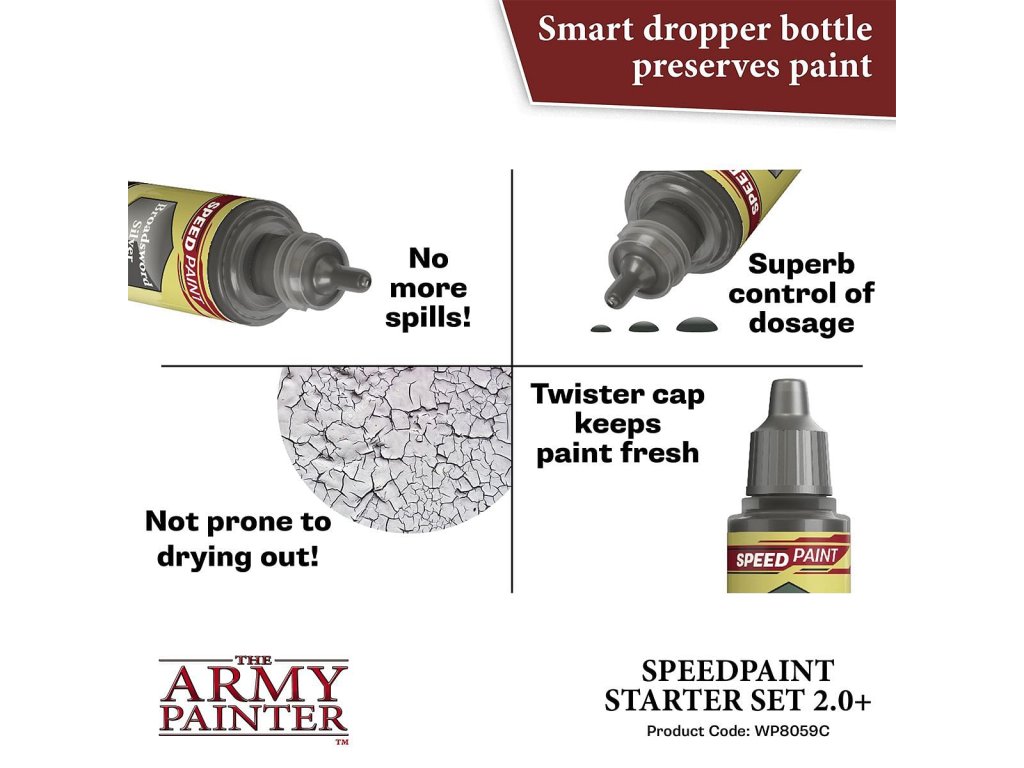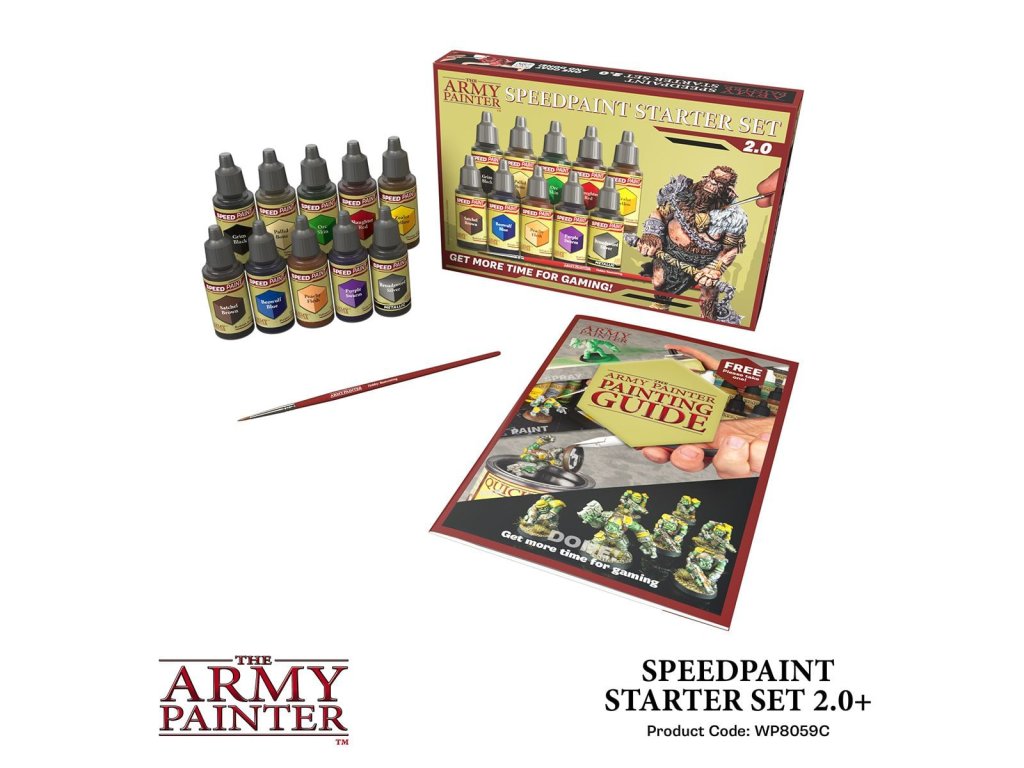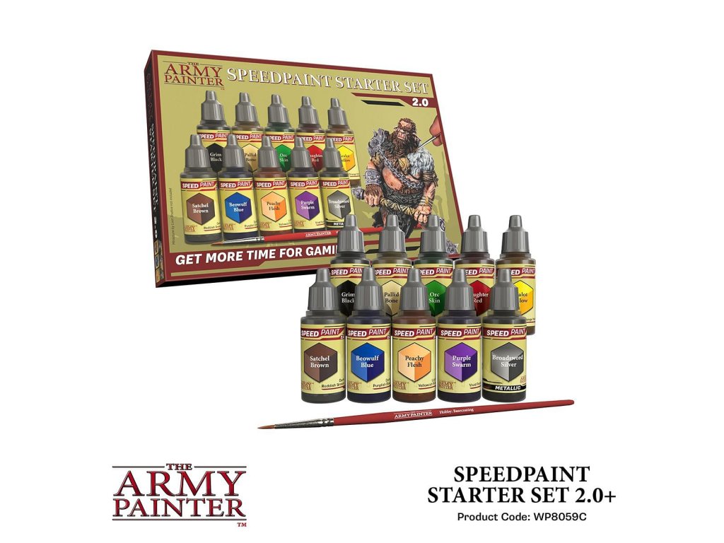 Sada Army Painter: Speedpaint Starter Set 2.0 obsahuje 10 základných farieb s vylepšenou receptúrou, s ktorými môžeš ihneď začať farbiť miniatúry. Stačí len naniesť vrstvu farby Speedpaint na miniatúru opatrenú základným náterom a máš hotovo. Farby Speedpaint ti ušetria čas na hranie! Súčasťou balenia je aj 1 štetec Basecoat Brush a anglický sprievodca farbením. Objem každej fľaštičky je 18ml a obsahuje dve miešacie guličky. Farby v balení: Pallid Bone Zealot Yellow Broadsword Silver Slaughter Red Satchel Brown Purple Swarm Boewulf Blue Orc Skin Peachy