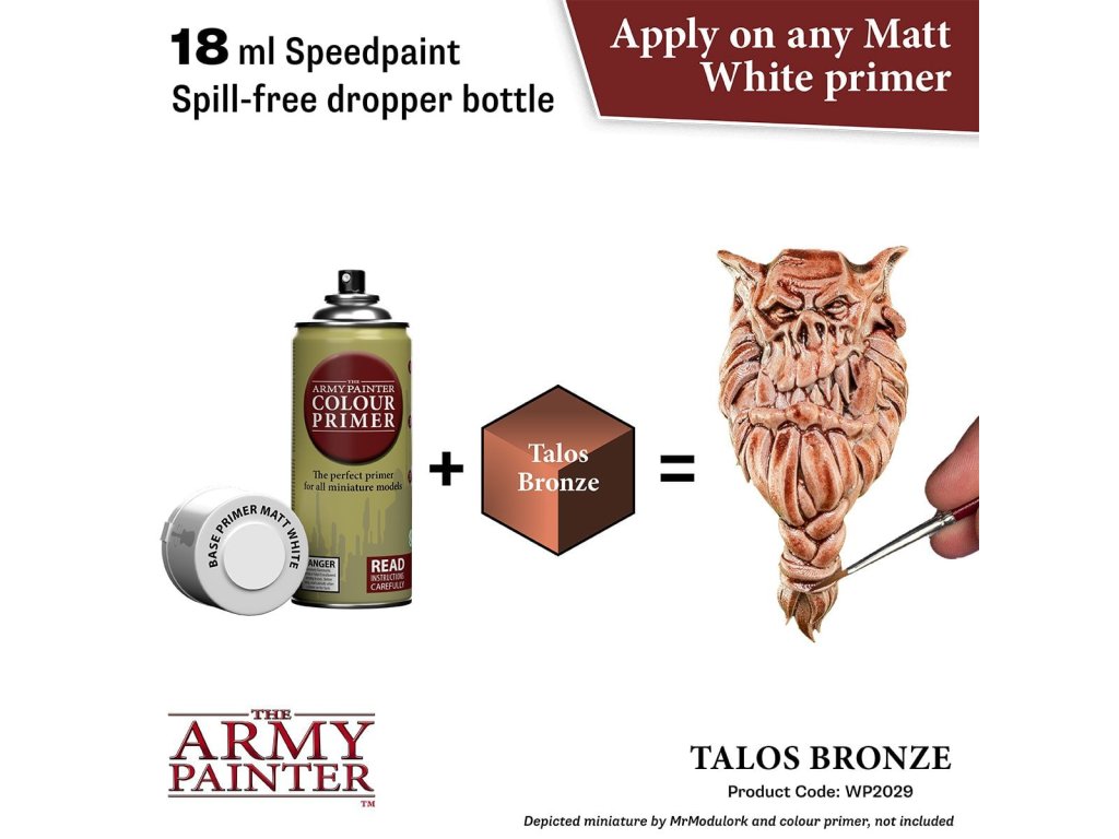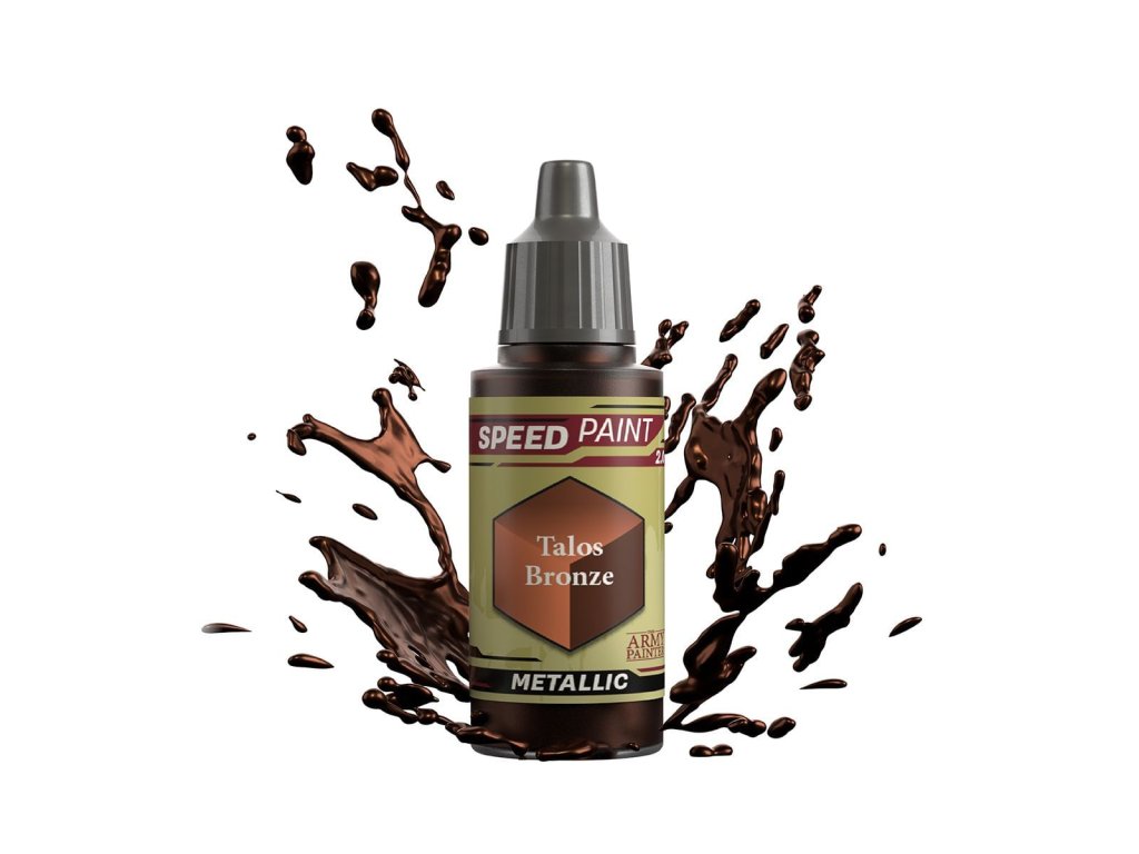 Vysoko kvalitná metalická farba Speedpaint Talos Bronze 2.0 od značky Army Painter sa líši lepším novým zložením ako predchádzajúci rad Speedpaint. Farba je vhodná pre miniatúry akéhokoľvek druhu. Farby radu Speedpaint majú redšiu konzistenciu a tým figúrku perfektne vytieňujú vo všetkých záhyboch a skulinách, napriek tomu majú dostatok pigmentu na perfektné krytie. Farbu už neriedime vodou a nanášame na miniatúru ošetrenú základným sprejom alebo farbou. Vzhľadom na konzistenciu farby, odporúčame použiť skôr pevnú paletu. Všetky farby Speedpaint sa dodávajú s dvoma oceľovými miešacími guličkami už vloženými do fľaštičky, čo vám uľahčí dosiahnutie dokonalej konzistencie bez nutnosti dlhého pretrepávania.