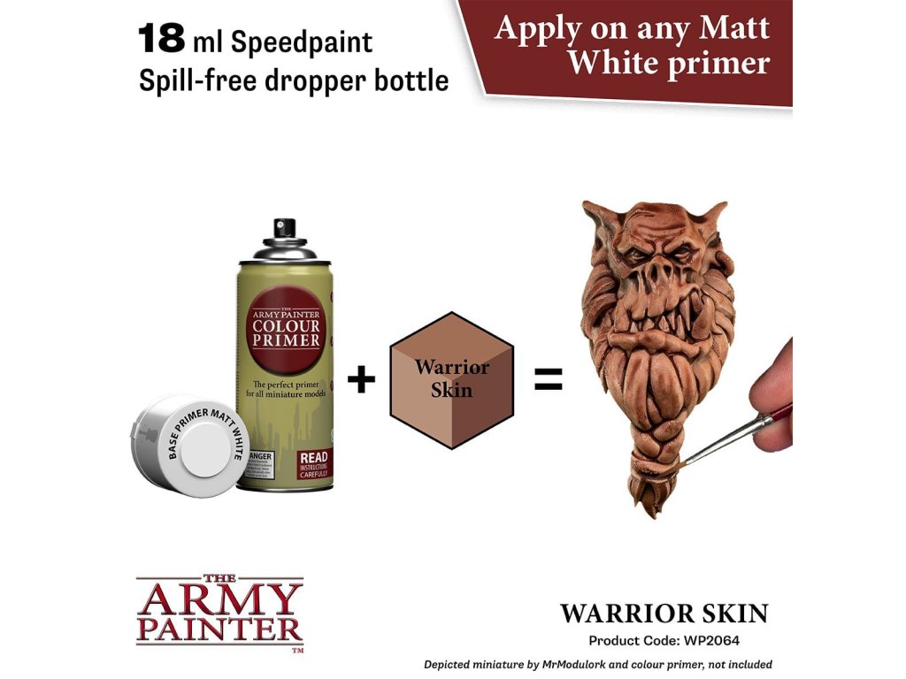 Vysoko kvalitná farba Speedpaint Warrior Skin 2.0 od značky Army Painter sa líši lepším novým zložením ako predchádzajúci rad Speedpaint. Farba je vhodná pre miniatúry akéhokoľvek druhu. Farby radu Speedpaint majú redšiu konzistenciu a tým figúrku perfektne vytieňujú vo všetkých záhyboch a skulinách, napriek tomu majú dostatok pigmentu na perfektné krytie. Farbu už neriedime vodou a nanášame na miniatúru ošetrenú základným sprejom alebo farbou. Vzhľadom na konzistenciu farby, odporúčame použiť skôr pevnú paletu. Všetky farby Speedpaint sa dodávajú s dvoma oceľovými miešacími guličkami už vloženými do fľaštičky, čo vám uľahčí dosiahnutie dokonalej konzistencie bez nutnosti dlhého pretrepávania.