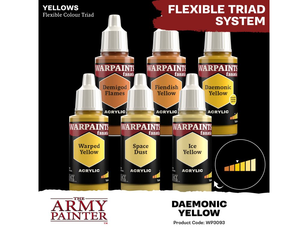 Akrylová farba Warpaints Fanatic - Daemonic Yellow od výrobcu Army Painter je vhodná pre miniatúry akéhokoľvek druhu. Farby Warpaints Fanatic ponúkajú bezkonkurenčné krytie, intenzívnu pigmentáciu, hladkú aplikáciu a zároveň sa neuveriteľne ľahko používajú. Farbu bohatú na pigmenty je možné riediť až do extrémnych úrovní pre pokročilých technikov alebo nanášať priamo na miniatúru pre ľahké pokrytie pri zachovaní rozptylu pigmentu. Objem každej fľaštičky je 18 ml a obsahuje dve miešacie guličky.