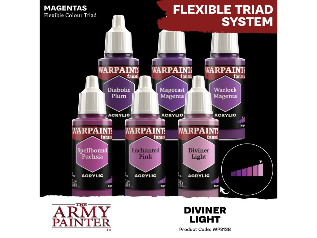 Akrylová farba Warpaints Fanatic - Diviner Light od výrobcu Army Painter je vhodná pre miniatúry akéhokoľvek druhu. Farby Warpaints Fanatic ponúkajú bezkonkurenčné krytie, intenzívnu pigmentáciu, hladkú aplikáciu a zároveň sa neuveriteľne ľahko používajú. Farbu bohatú na pigmenty je možné riediť až do extrémnych úrovní pre pokročilých technikov alebo nanášať priamo na miniatúru pre ľahké pokrytie pri zachovaní rozptylu pigmentu. Objem každej fľaštičky je 18 ml a obsahuje dve miešacie guličky.