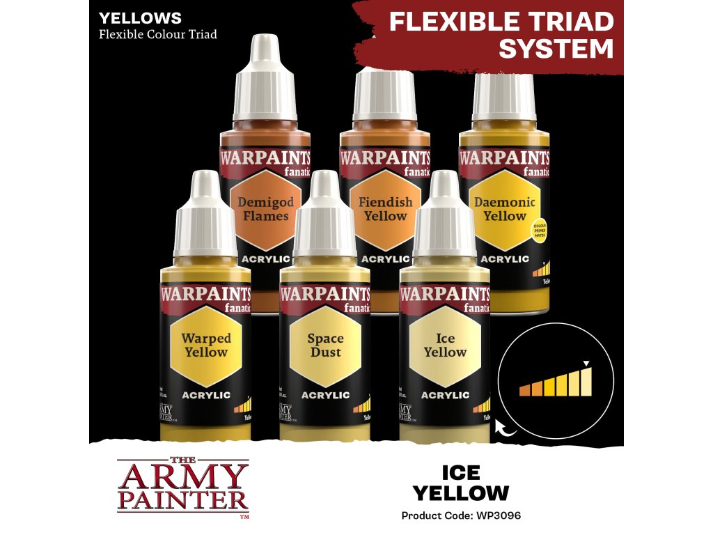 Akrylová farba Warpaints Fanatic - Ice Yellow od výrobcu Army Painter je vhodná pre miniatúry akéhokoľvek druhu. Farby Warpaints Fanatic ponúkajú bezkonkurenčné krytie, intenzívnu pigmentáciu, hladkú aplikáciu a zároveň sa neuveriteľne ľahko používajú. Farbu bohatú na pigmenty je možné riediť až do extrémnych úrovní pre pokročilých technikov alebo nanášať priamo na miniatúru pre ľahké pokrytie pri zachovaní rozptylu pigmentu. Objem každej fľaštičky je 18 ml a obsahuje dve miešacie guličky.