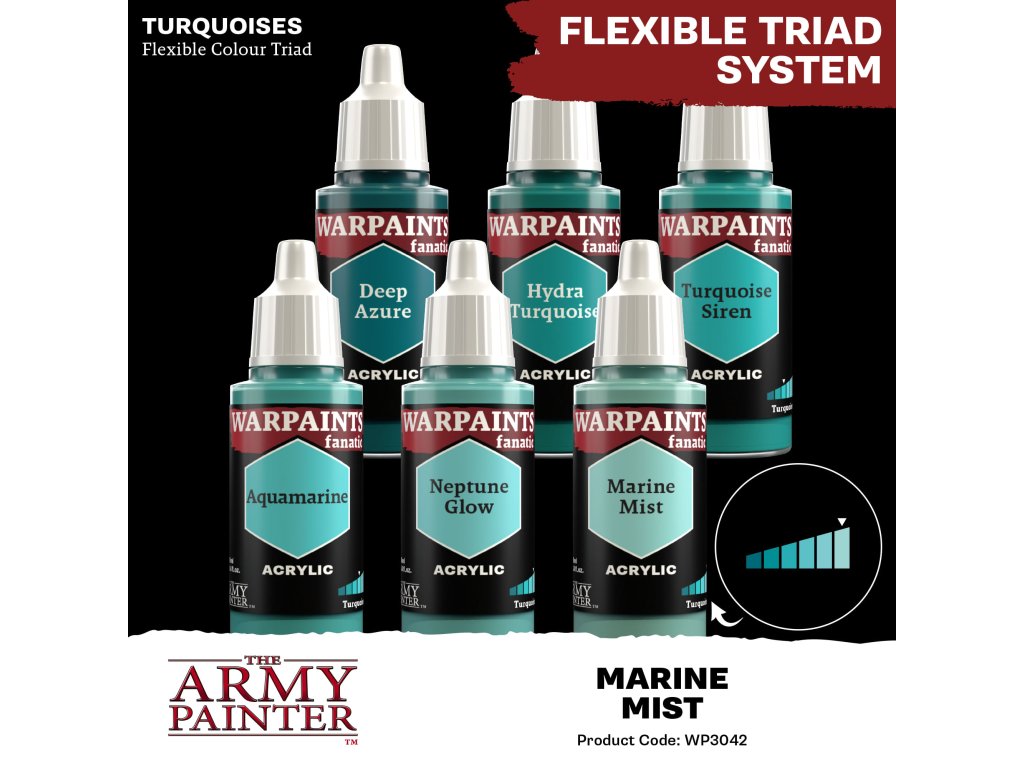 Akrylová farba Warpaints Fanatic - Marine Mist od výrobcu Army Painter je vhodná pre miniatúry akéhokoľvek druhu. Farby Warpaints Fanatic ponúkajú bezkonkurenčné krytie, intenzívnu pigmentáciu, hladkú aplikáciu a zároveň sa neuveriteľne ľahko používajú. Farbu bohatú na pigmenty je možné riediť až do extrémnych úrovní pre pokročilých technikov alebo nanášať priamo na miniatúru pre ľahké pokrytie pri zachovaní rozptylu pigmentu. Objem každej fľaštičky je 18 ml a obsahuje dve miešacie guličky.