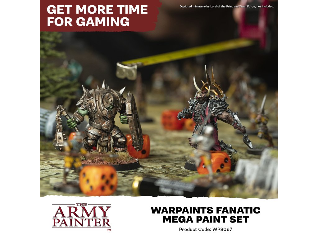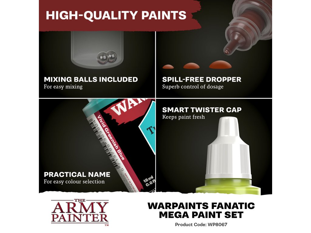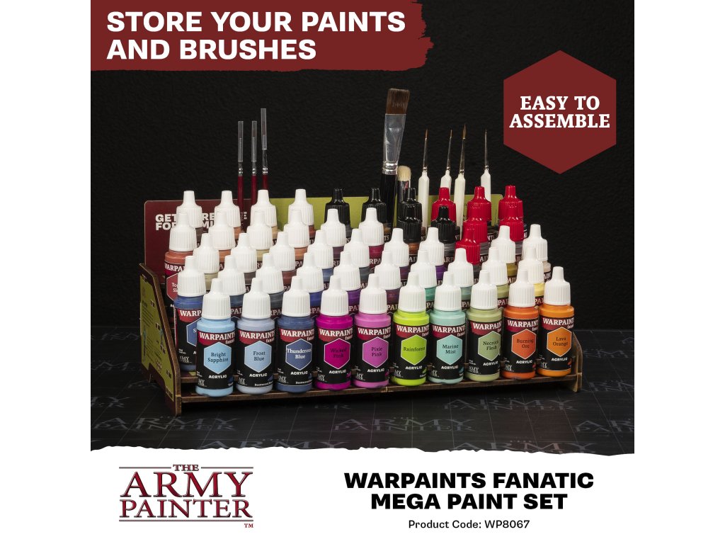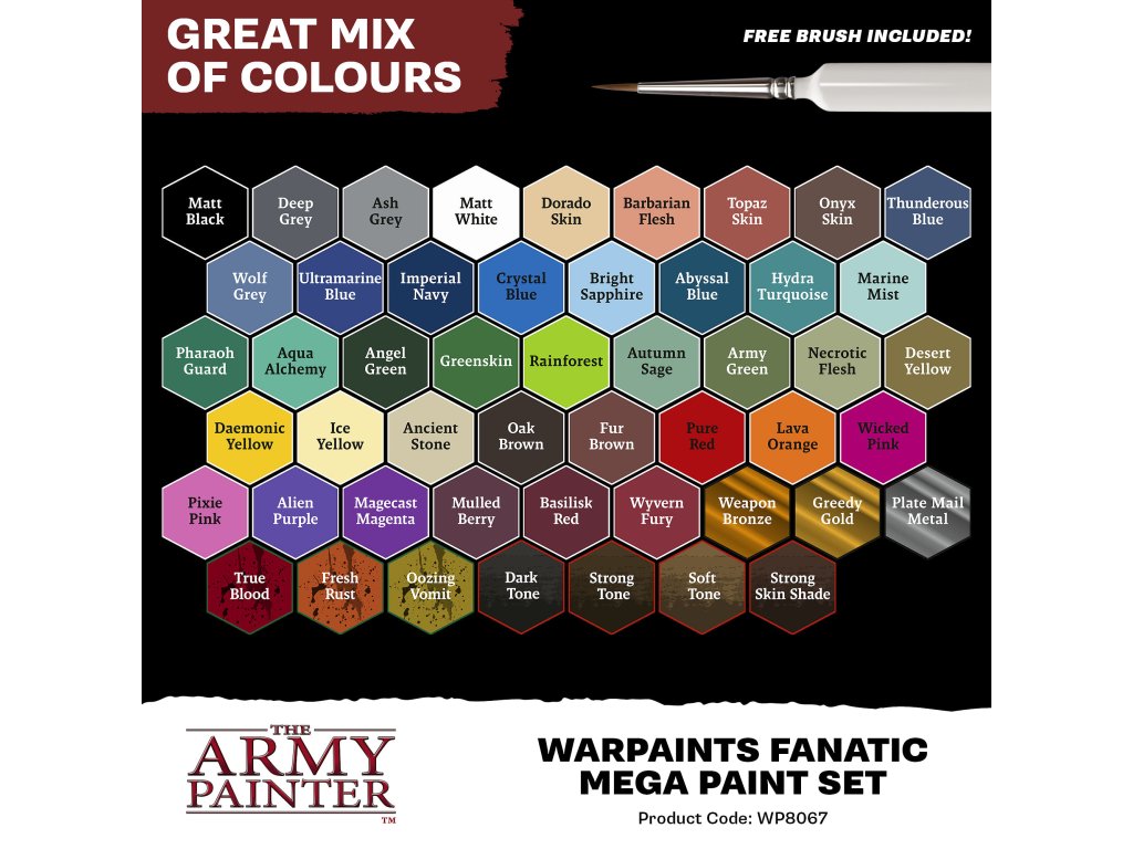 Mega Set obsahuje 50 farieb z novej rady Warpaints Fanatic od výrobcu Army Painter. V balení nájdeš aj štetec a stojan na farby zadarmo. Farby Warpaints Fanatic ponúkajú bezkonkurenčné krytie, intenzívnu pigmentáciu, hladkú aplikáciu a zároveň sa neuveriteľne jednoducho používajú. Farbu bohatú na pigmenty je možné riediť až do extrémnych úrovní pre pokročilých technikov alebo nanášať priamo na miniatúru pre ľahké pokrytie pri zachovaní rozptylu pigmentu. Objem každej fľaštičky je 18ml a obsahuje dve miešacie guličky. Obsah balenia: 36 akrylových farieb 4 wash farby 4 skin tone farby 3 metalické farby 3 effect farby stojan štetec