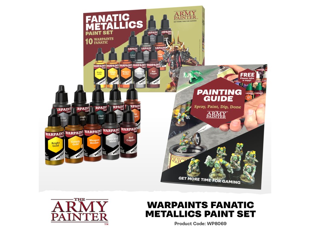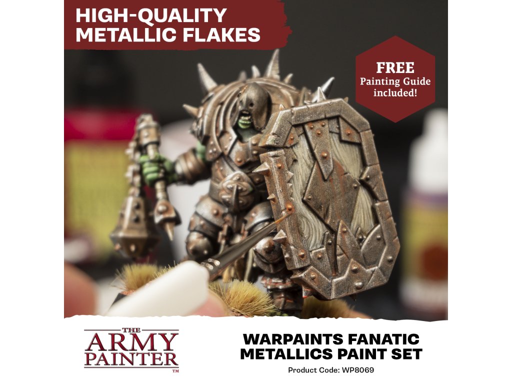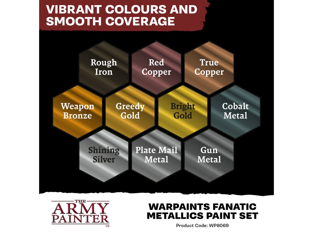 Sada Metallics obsahuje 10 farieb z nového radu Warpaints Fanatic od výrobcu Army Painter. Metalické farby využijete obzvlášť pri maľovaní brnení, zbraní alebo zbrojí. Farby Warpaints Fanatic ponúkajú bezkonkurenčné krytie, intenzívnu pigmentáciu, hladkú aplikáciu a zároveň sa neuveriteľne jednoducho používajú. Farbu bohatú na pigmenty je možné riediť až do extrémnych úrovní pre pokročilých technikov alebo nanášať priamo na miniatúru pre ľahké pokrytie pri zachovaní rozptylu pigmentu. Objem každej fľaštičky je 18ml a obsahuje dve miešacie guličky. Obsah balenia: Rough Iron Red Copper True Copper Weapon Bronze Greed Gold Bright Gold Cobalt Metal Shining Silver Plate Mail Metal Gun Metal
