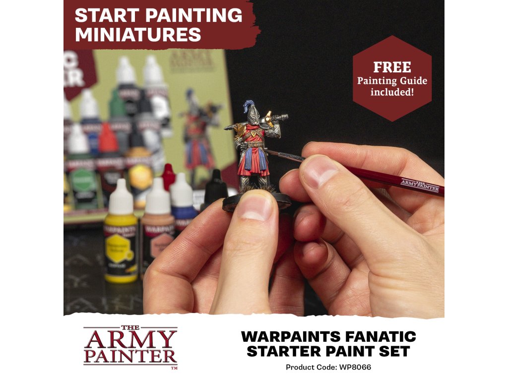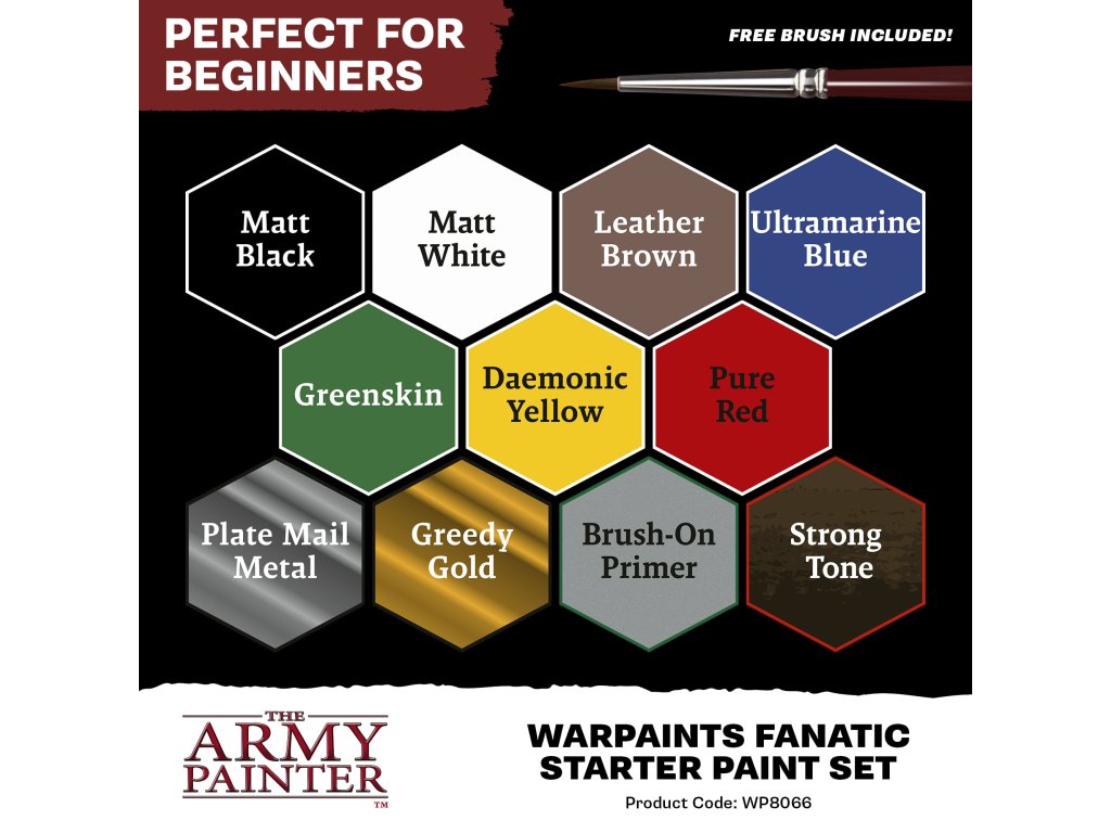 Súprava Starter Set obsahuje 10 základných farieb a Brush-On Primer z novej rady Warpaints Fanatic od výrobcu Army Painter. Farby Warpaints Fanatic ponúkajú bezkonkurenčné krytie, intenzívnu pigmentáciu, hladkú aplikáciu a zároveň sa neuveriteľne jednoducho používajú. Farbu bohatú na pigmenty je možné riediť až do extrémnych úrovní pre pokročilých technikov alebo nanášať priamo na miniatúru pre ľahké pokrytie pri zachovaní rozptylu pigmentu. Objem každej fľaštičky je 18ml a obsahuje dve miešacie guličky. Obsah balenia: Matt Black Matt White Leather Brown Ultramarine Blue Greenskin Daemonic Yellow Pure Red Plate Mail Metal Greedy Gold Brush-On Primer Strong Tone