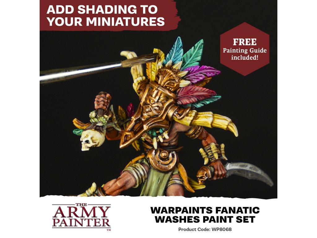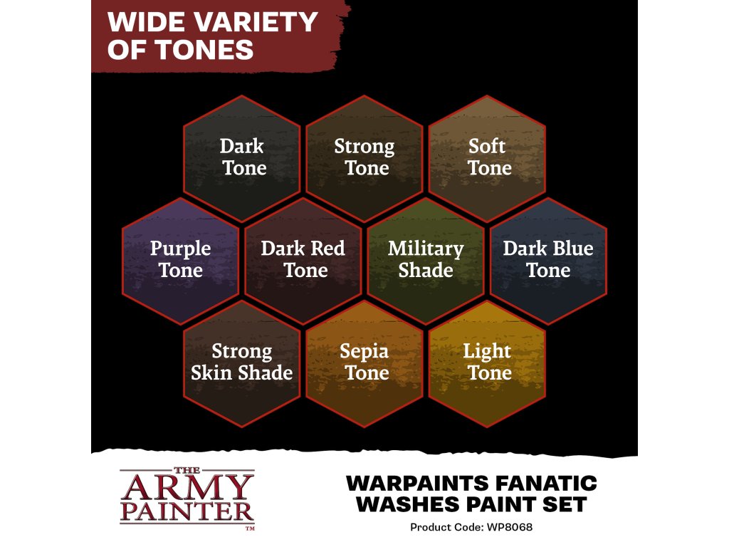 Súprava Washes Paint obsahuje 10 farieb z nového radu Warpaints Fanatic od výrobcu Army Painter. Vďaka wash farbám ľahko a rýchlo vytvoríte dojem hĺbky a tieňovania na vašich modeloch a miniatúrach. Farby Warpaints Fanatic ponúkajú bezkonkurenčné krytie, intenzívnu pigmentáciu, hladkú aplikáciu a zároveň sa neuveriteľne jednoducho používajú. Farbu bohatú na pigmenty je možné riediť až do extrémnych úrovní pre pokročilých technikov alebo nanášať priamo na miniatúru pre ľahké pokrytie pri zachovaní rozptylu pigmentu. Objem každej fľaštičky je 18ml a obsahuje dve miešacie guličky. Obsah balenia: Dark Tone Strong Tone Soft Tone Purple Tone Dark Red Tone Military Shade Dark Blue Tone Strong Skin Shade Sepia Tone Light Tone