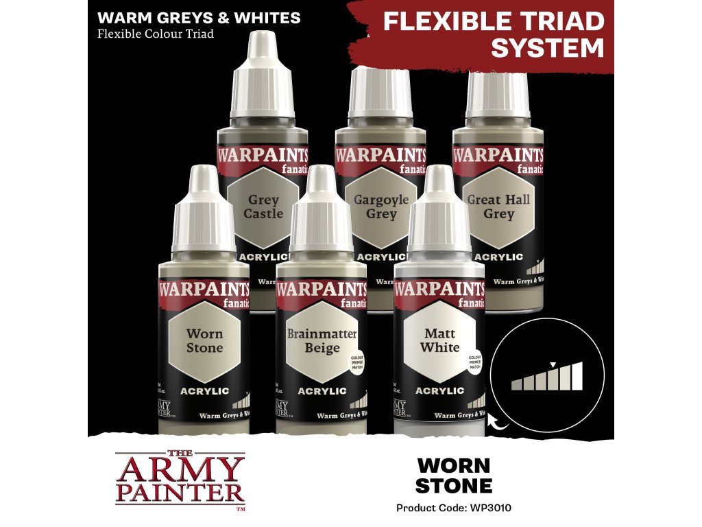 Akrylová farba Warpaints Fanatic - Worn Stone od výrobcu Army Painter je vhodná pre miniatúry akéhokoľvek druhu. Farby Warpaints Fanatic ponúkajú bezkonkurenčné krytie, intenzívnu pigmentáciu, hladkú aplikáciu a zároveň sa neuveriteľne ľahko používajú. Farbu bohatú na pigmenty je možné riediť až do extrémnych úrovní pre pokročilých technikov alebo nanášať priamo na miniatúru pre ľahké pokrytie pri zachovaní rozptylu pigmentu. Objem každej fľaštičky je 18 ml a obsahuje dve miešacie guličky.