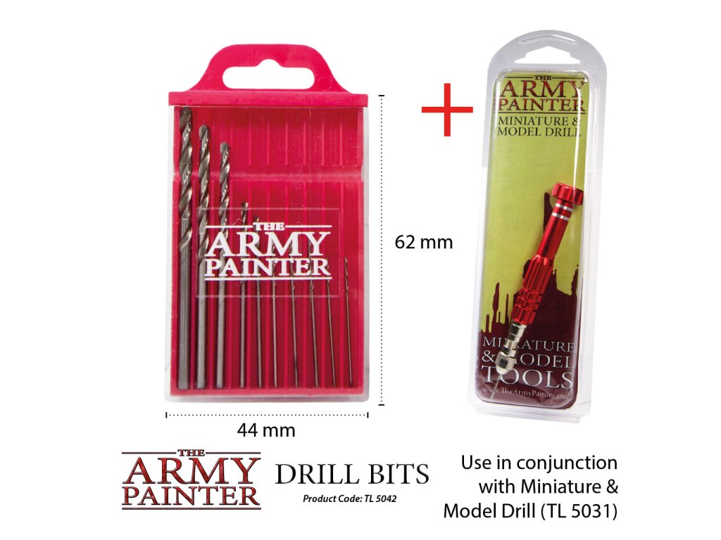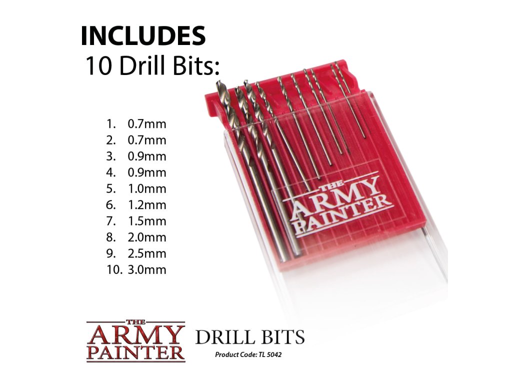 Súprava obsahuje 10 ks vrtákov Army Painter určených pre ručnú vŕtačku na modely a miniatúry - Miniature & Model Drill. V balení nájdete vrtáky s priemerom: 2 x 0,7 mm, 2 x 0,9 mm, 1 x 1 mm, 1 x 1,2 mm, 1 x 1,5 mm, 1 x 2 mm, 1 x 2,5 mm a 1 x 3 mm (vhodný na magnety).