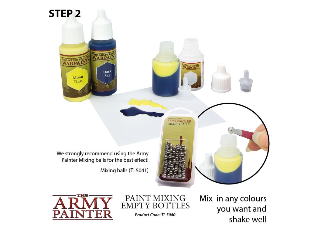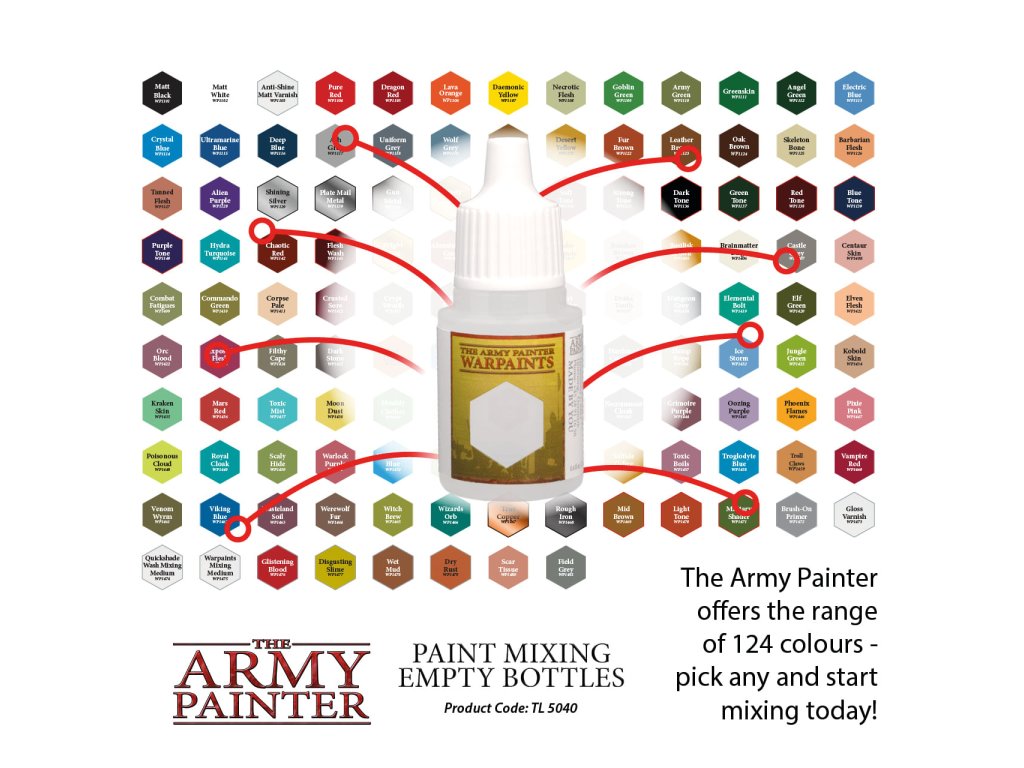 Army Painter Mixing Empty Bottles je sada 6 prázdnych fľaštičiek, každá s objemom 12ml, určených na miešanie modelárskych farieb.