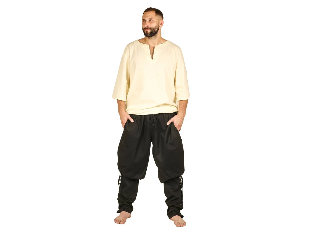 Napokon pohodlné nohavice pre každú príležitosť! Štýlové čierne nohavice so širokým pásom sú ušité z prvotriednej bavlny. Vďaka kvalitnému materiálu sa v nich budete vždy cítiť príjemne po náročnom dni na poli aj na bojisku. Zúžené nohavice si môžete šnurovaním utiahnuť tak, aby vám perfektne sedeli. Navyše majú nohavice dve priestranné vrecká. Vďaka ich charakteristickému vzhľadu poslúži ako skvelý základ historického alebo fantasy kostýmu. Využijete ich tak na dreváreň, fantasy LARP aj historický jarmok. Môžete si ich zaobstarať aj v slušivej hnedej variante. Vytvorte si perfektný kostým a kúpte si k nohaviciam aj koženú vestu z našej ponuky. Blíži sa zima? Radšej nič neriskujte a zabaľte sa do elegantného plášťa.