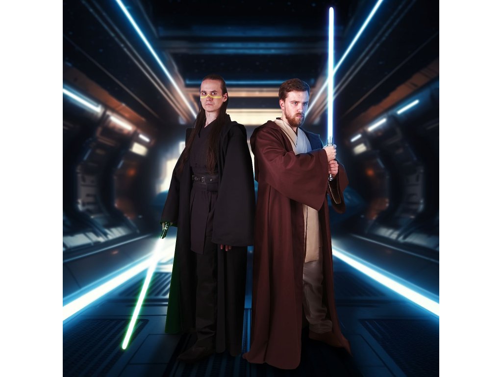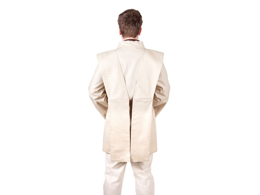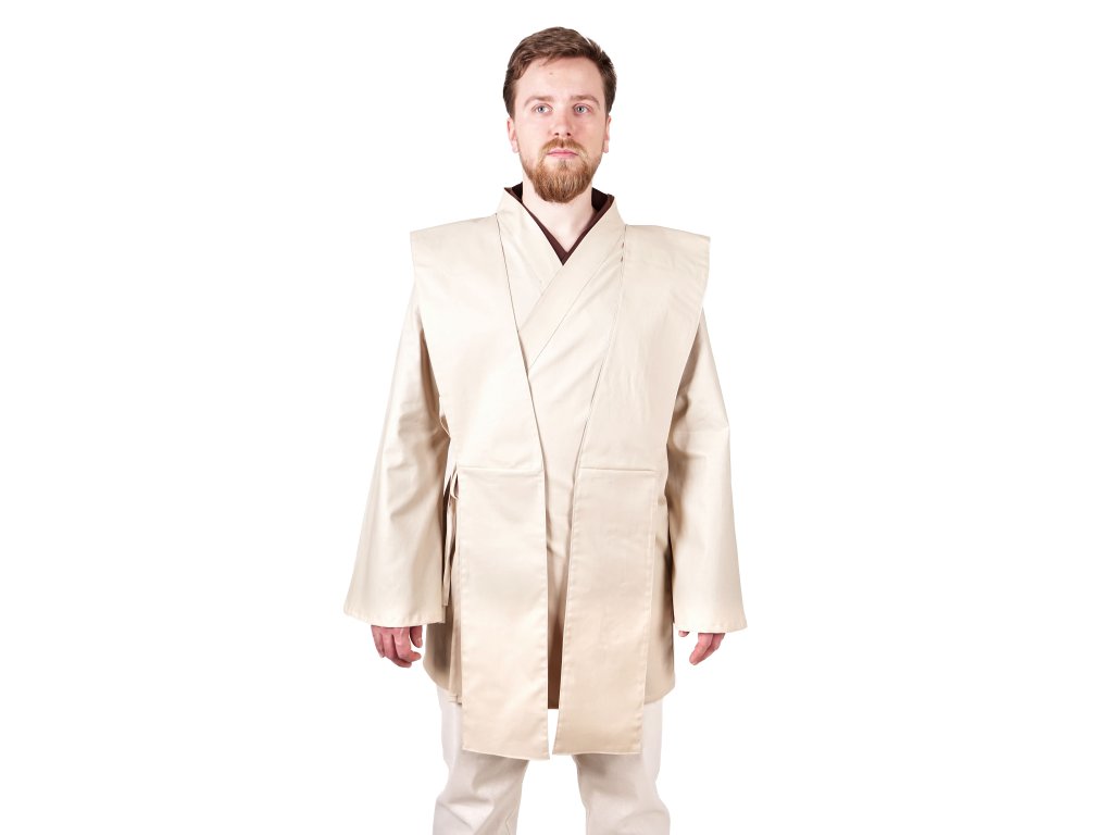 Bavlnený tabard béžovej farby pre všetkých rytierov a majstrov Jedi aj ich nádejné Padawany. Nevyhnutná súčasť úboru, ktorý je odznakom svetlej strany sily rovnako ako ikonický svetelný meč. V našom kostýme Jedi urobíte perfektný dojem v tej najhoršej putyke Mos Eisley aj v Galaktickom senáte na Coruscante. Tabard sa skladá z dvoch širokých pruhov látky, ktoré sa prehadzujú cez ramená a voľne visí na chrbte aj cez hrudník. Perfektný dojem potom dosahujú pri kombinácii s tunikou a prepásaní látkovým opaskom sash. Tabard je vyrobený zo 100% bavlny prvotriednej kvality. Okrem tradičnej béžovej farby tabardy vyrábame aj v tmavo hnedej variante, alebo štýlovej čiernej farbe. Dokonalý kostým rytierov Jedi, ochrancov mieru vo svete Star Wars, vytvoríte spojením piatich častí: okrem štýlového tabardu budete potrebovať spodnú tuniku, vrchnú tuniku, bavlnený opasok sash a plášť majstrov Jedi. To všetko navyše môžete doplniť koženým opaskom s vreckami a legendárnou zbraňou rytierov Jedi - svetelným mečom. Model je vysoký 178 cm a má na sebe tuniky aj tabard Jedi veľkosti M. Veľkosť tabardu odporúčame zvoliť podľa veľkosti vybranej vrchnej tuniky. Tabard zodpovedá oficiálnym štandardom Star Wars kostýmovej organizácie.