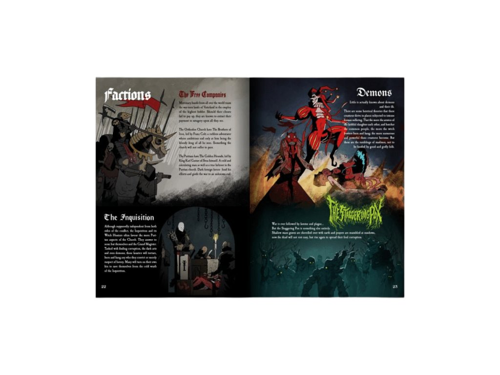 Priprav sa na výbuchy mágie a hrmenia pušného prachu! Základné pravidlá pre Black Powder and Brimstone ti otvoria dvere do nebezpečného sveta fantasy divokého západu, kde sa stretáva klasické westernové dobrodružstvo s démonológiou, okultizmom a parnou technikou. Táto kniha je tvojím sprievodcom do sveta lovcov démonov, pištoľníkov i podivných vynálezcov. Nájdeš v nej všetko potrebné – od tvorby postáv, cez jedinečný systém súbojov až po mágiu a temné sily. Ideálne pre hráčov a rozprávačov, ktorí hľadajú atmosférické, akčné RPG s poriadne štýlovým twistom. A grimdark fantasy RPG, compatible s MÖRK BORG Embark on dark and daring dobrodružstvo kde death and destruction lurks okolo every corner. Gumpowder a witchcraft infúzovaná hra je kompletná stan-alone RPG na základe a compatible s multi-award-winning apokalyptický heavy metal RPG MÖRK BORG. Táto akcia packed, rules light, art heavy OSR game offers swashbuckling dobrodružstvo a gotický folk horor v in unloly blend. Key Features: A wicked cauldron hry packed to brim with lore, explosions, magic, war, a demons. Be a desperate adventurer stuck v strede conflict desperately trying to survive, a maybe even profit, medzi chaos a destruction. Wield unique a characterful weapons, všetky s ich vlastnou rules a advantages na vrchole damage die. Použite forbidden and powerful magics, ktorý môže warp reality, as easily as an artist paints a canvas. A pomôcka hrudníka charakter opcií, položky, umiestnenia, dobrodružstvá, a enemies ako ľudské a monštrum waiting to be opened.
