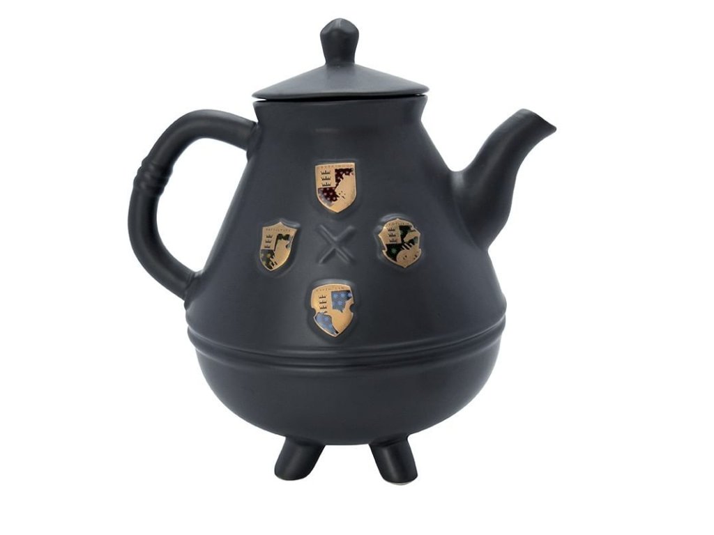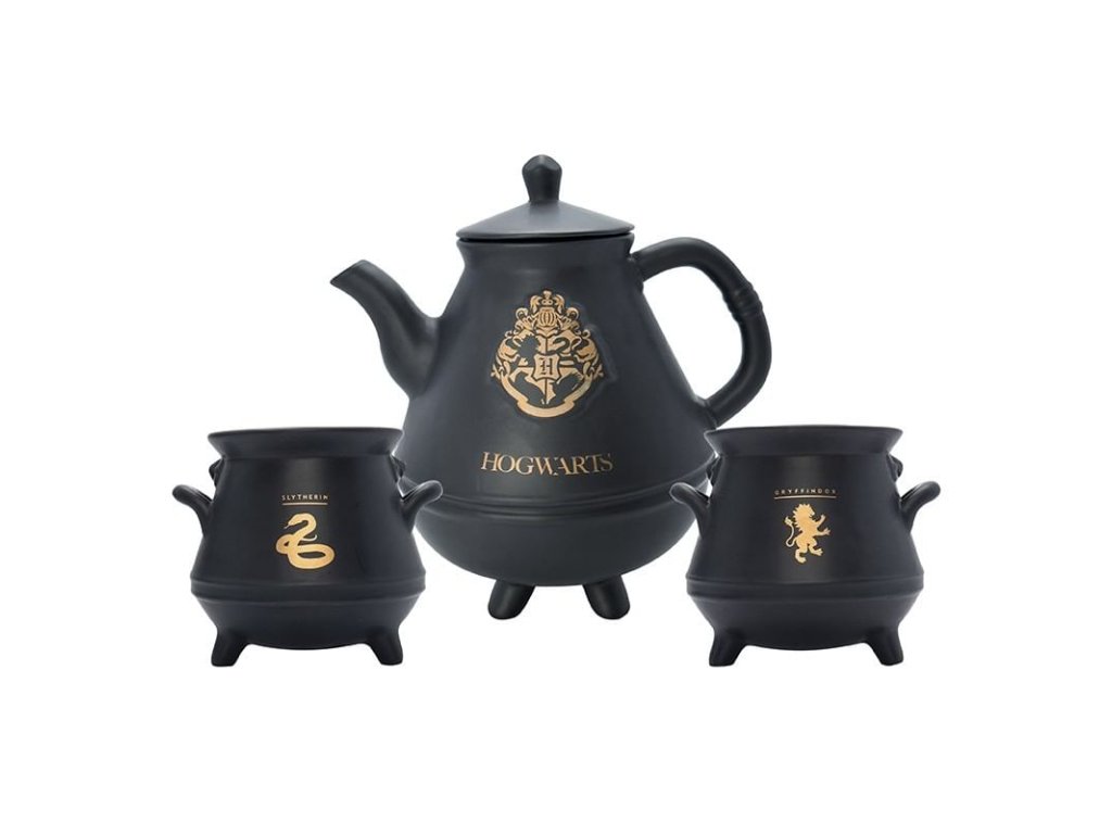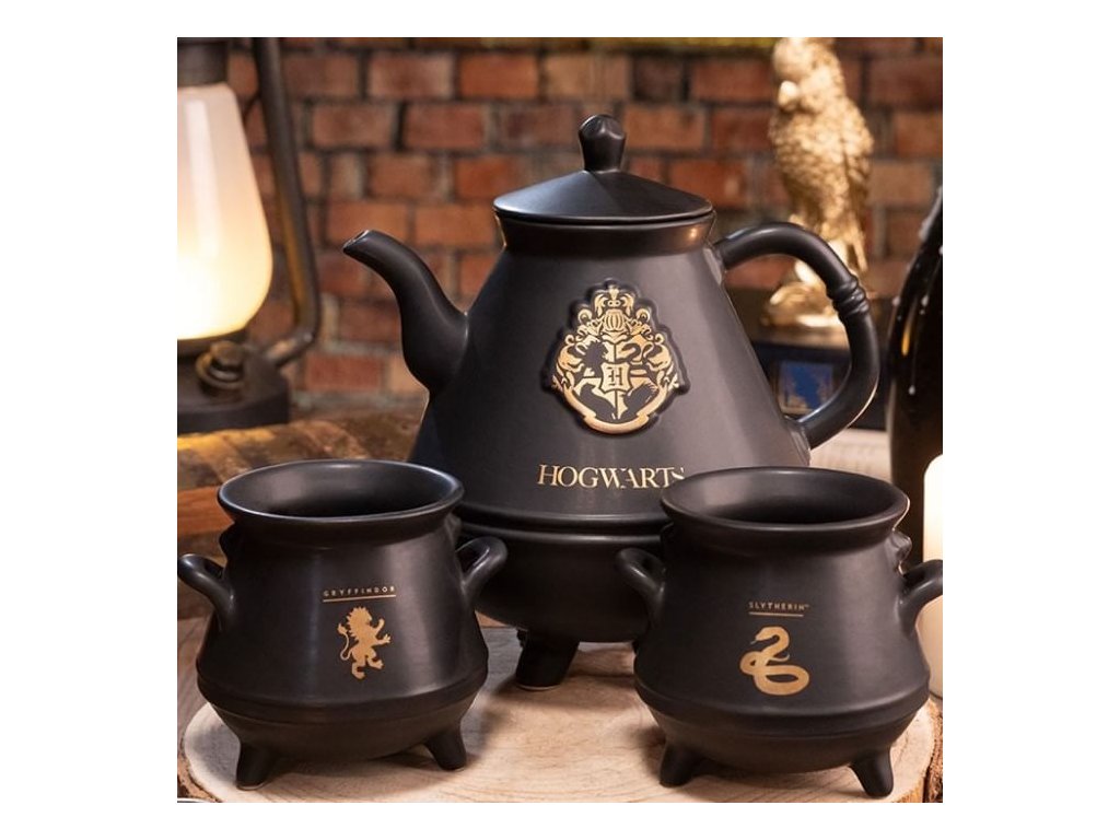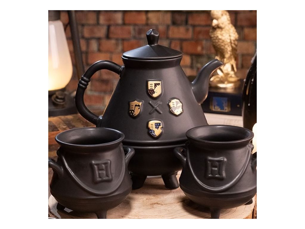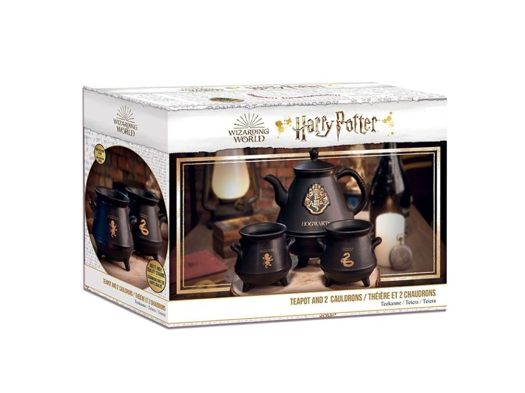 Darčeková sada pre čajomilcov a fanúšikov magických príbehov o Harrym Potterovi obsahuje krásnu čiernu litrovú kanvicu so zlatými znakmi školy čiar a kúziel v Rokforte a štvoricu tamojších čarodejných koľají, ďalej potom pár hrnčekov v podobe kotlíkov na lektvary - jeden so symbolom Zel. Súprava nie je vhodná do mikrovlnky a umývačky riadu.
