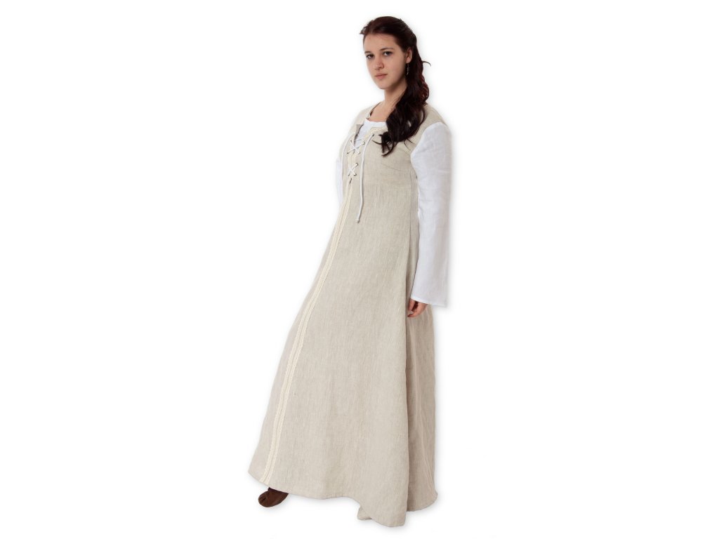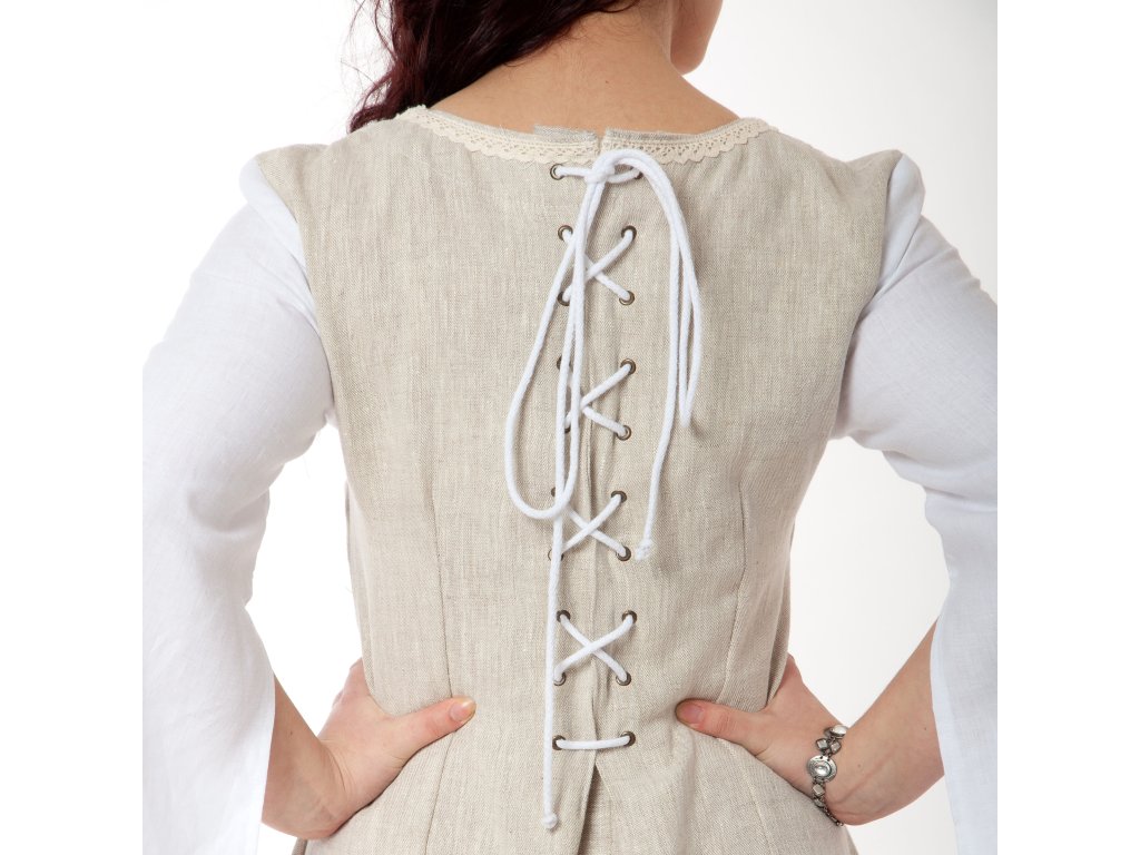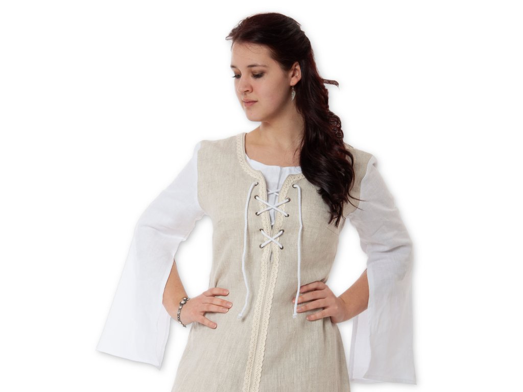 Hľadáte šaty v ktorých sa snúbi elegancia a jednoduchosť? Decentne vypasované dámske šaty Luthien s rafinovaným zadným šnurovaním sa prispôsobia vašej postave a dajú vyniknúť vašim ženským prednostiam. Kombinácia prírodného a bieleho ľanu pohladí na duši aj na tele. Predný diel je podšitý do úrovne pása bielym ľanom pre príjemné nosenie, pôsobí ako blúza s elegantnými rukávmi, ktoré sú od lakťa dole otvorené. Šaty zdobí jemný bavlnený prámik. Opasok a doplnky nie sú súčasťou šiat. Viac o použitom materiáli sa dočítate tu: popis materiálov.