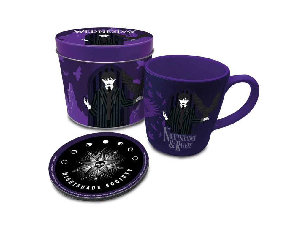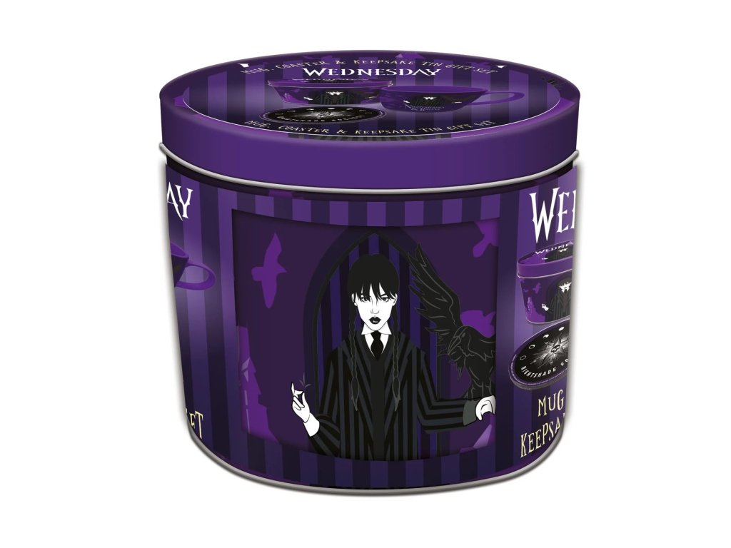 Krásnu darčekovú sadu pre fanúšikov seriálu Wednesday tvorí keramický hrnček a podtáček v praktickej plechovej krabičke s grafikou obľúbenej hrdinky Wednesday Addamsovej.